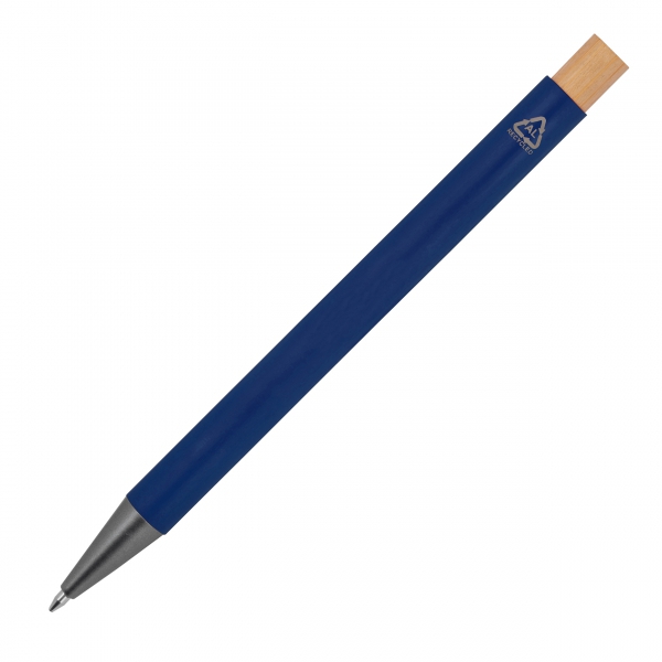 Długopis metalowy wykonany z aluminium pochodzącego z recyklingu to elegancki i praktyczny wybór na co dzień. Jego korpus wyróżnia się trwałością, a bambusowy przycisk dodaje naturalnego akcentu. Metalowy klips zapewnia wygodne przypięcie do notesu lub kieszeni, a wkład piszący na niebiesko gwarantuje płynność i komfort pisania.To połączenie klasyki i ekologicznych materiałów sprawia, że długopis doskonale sprawdzi się zarówno w biurze, jak i w codziennym użytkowaniu.