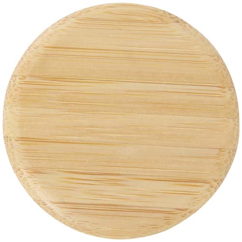 Butelka na wodę ze szkła o pojedynczych ściankach, wyposażona w zakrętkę wykonaną z bambusa, pochodzącą z bardziej zrównoważonych i społecznie odpowiedzialnych źródeł. W zestawie znajduje się wygodny silikonowy pasek ułatwiający noszenie. Zapakowane w pudełko upominkowe wykonane z kartonu z recyklingu. Pojemność: 500 ml.