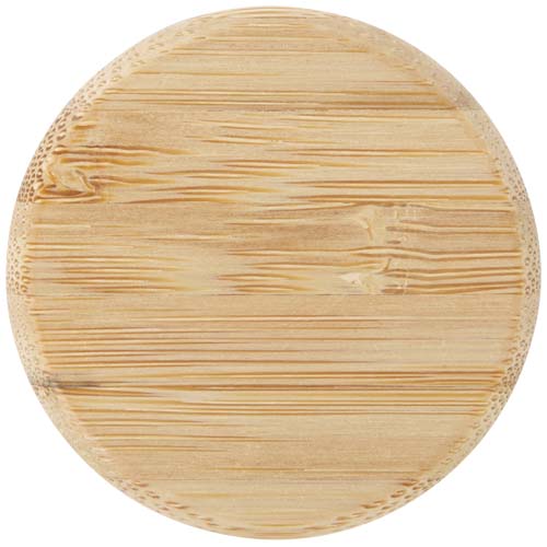 Butelka na wodę ze szkła o pojedynczych ściankach, wyposażona w zakrętkę wykonaną z bambusa, pochodzącą z bardziej zrównoważonych i społecznie odpowiedzialnych źródeł. W zestawie znajduje się wygodny silikonowy pasek ułatwiający noszenie. Zapakowane w pudełko upominkowe wykonane z kartonu z recyklingu. Pojemność: 500 ml.