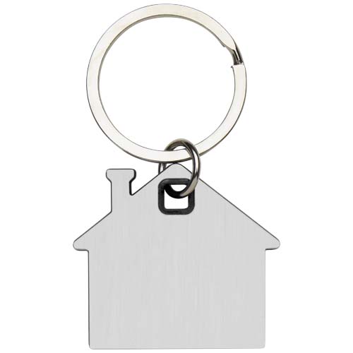 Łańcuszek do kluczy z brelokiem w kształcie domu, z płytką ze stali nierdzewnej o szczotkowanej strukturze z przodu i z tyłu oraz z kolorowym plastikowym elementem pośrodku.