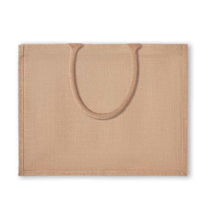 Jutowa laminowana torba na zakupy z krótkimi uchwytami, wykonanymi z bawełny.