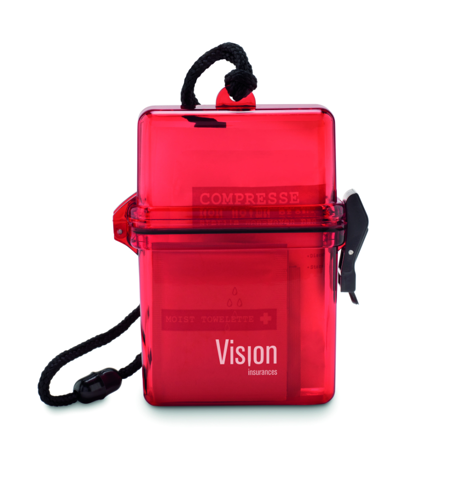Podręczna apteczka pierwszej pomocy zawierająca 5 plastrów z opatrunkiem, 2 gaziki nasączone alkoholem, 2 wilgotne chusteczki, 1 kompres. Całość zapakowana w plastikowe wodoszczelne pudełko.