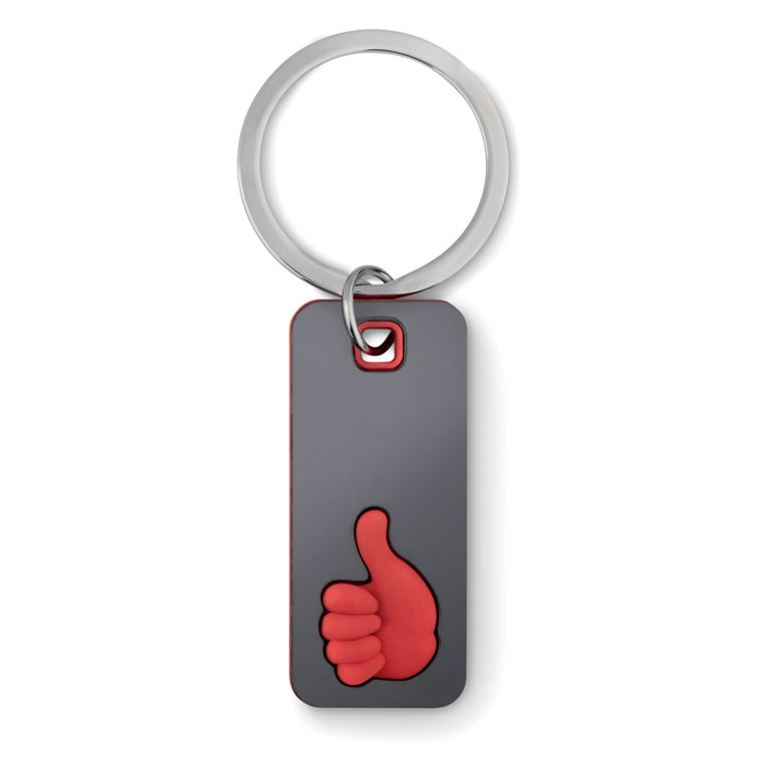 Prostokątny brelok ze stali nierdzewnej oraz elementami z ABS.