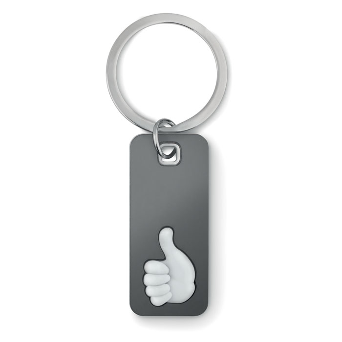 Prostokątny brelok ze stali nierdzewnej oraz elementami z ABS.