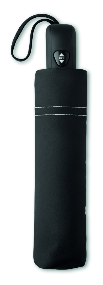 Składana na 3 parasolka 23'', dopasowane kolorystycznie żebra z włókna szklanego, automatycznie otwierany i zamykany, wykonany z czarnego materiału pongee 190T z dopasowanymi szwami, czarny metalowy trzon. Uchwyt z dopasowanymi kolorystycznie detalami.