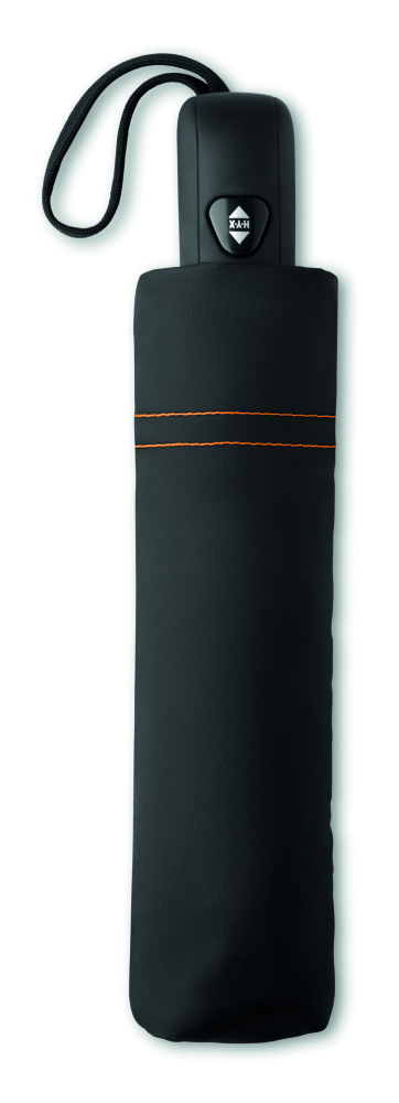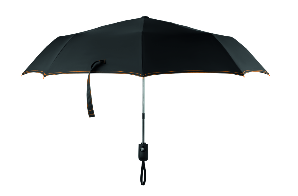 Składana na 3 parasolka 23'', dopasowane kolorystycznie żebra z włókna szklanego, automatycznie otwierany i zamykany, wykonany z czarnego materiału pongee 190T z dopasowanymi szwami, czarny metalowy trzon. Uchwyt z dopasowanymi kolorystycznie detalami.