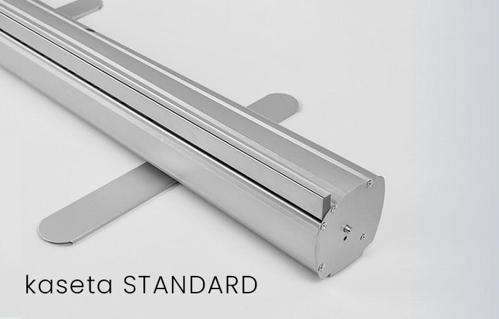 - Standard – kasetka ze sztywnego aluminium, wsparta na dwóch nóżkach stabilizujących. W zestawie trójdzielny maszt/maszty, górna listwa zaciskowa oraz torba transportowa.