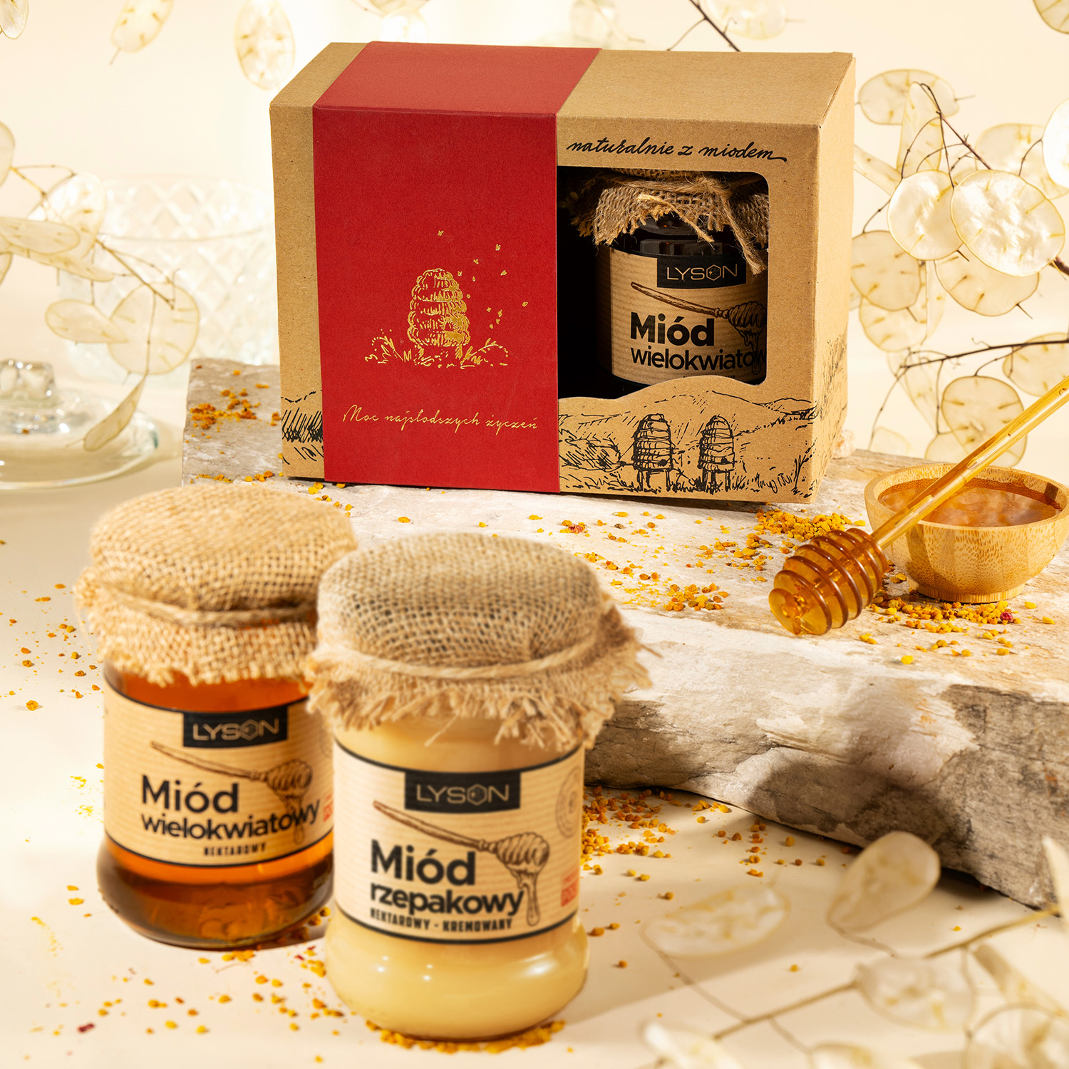 • Miód wielokwiatowy (400g): Złocisty skarb natury, bogaty w witaminy i minerały. To miód, który dodaje energii i wzmacnia organizm, pomagając przetrwać nawet najchłodniejsze dni. Doskonały do herbaty, porannej owsianki lub... jako przekąska prosto ze słoika.