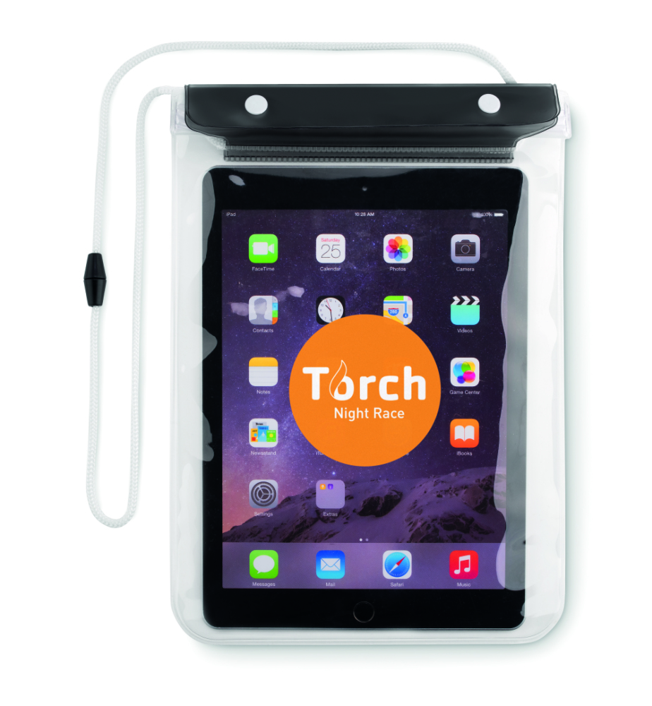 Wodoodporny pokrowiec na tablet wykonany z PVC z poliestrowym paskiem. Pokrowiec posiada zapięcie oraz cieńszą powierzchnię, która pozwala na obsługę ekranów dotykowych.