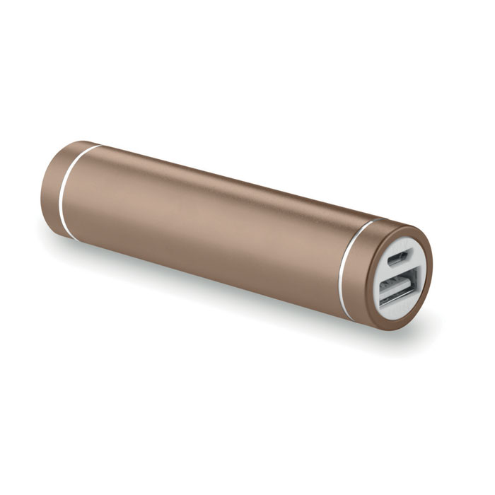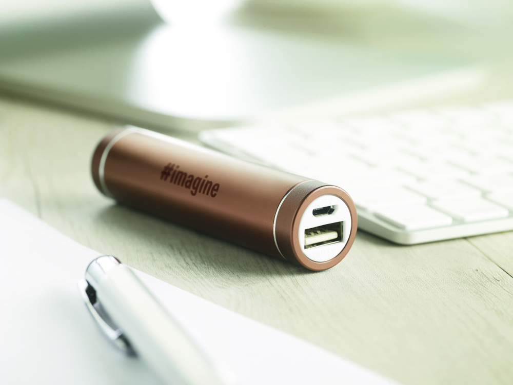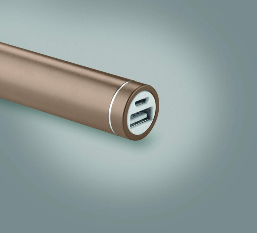 Powerbank 2200 mAh z aluminium o cylindrycznym kształcie. Odpowiedni do ładowania smartfona, moc prądu wyjściowego DC5V / 1A. Wyposażony w diodę i kabel USB z wtyczką micro USB.