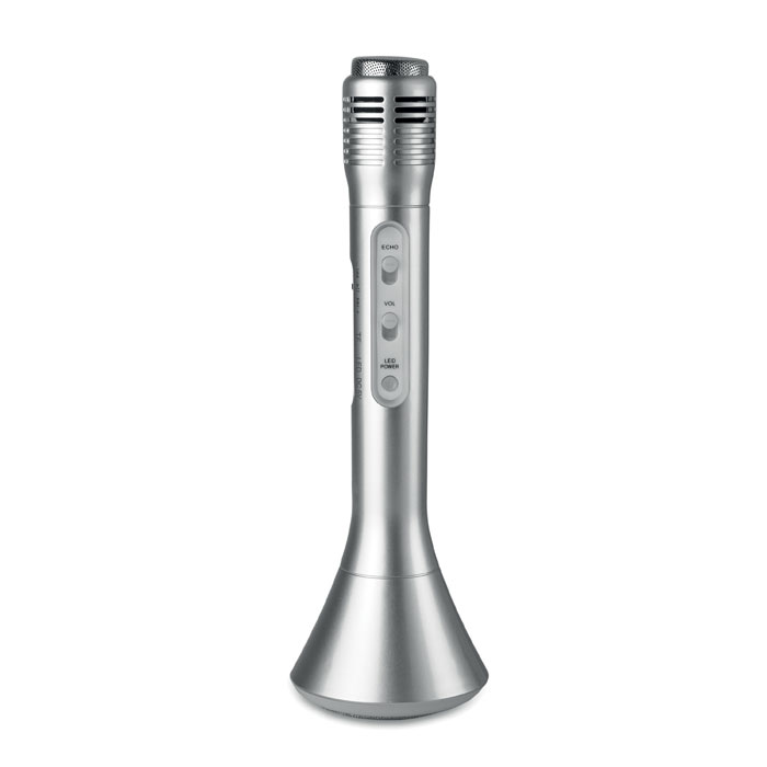 Bezprzewodowy mikrofon i przenośny głośnik karaoke z ABS, bluetooth 3.0. Posiada zmieniające się światło LED na dole, czas odtwarzania wynosi około 2-3 godziny. Wyposażony w gniazdo kart SD. Dostosowany do aplikacji karaoke, np. Yokee®. Pojemność: 1200mAh.