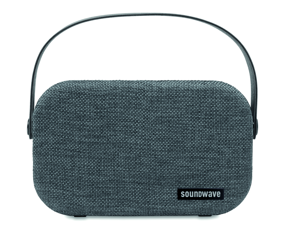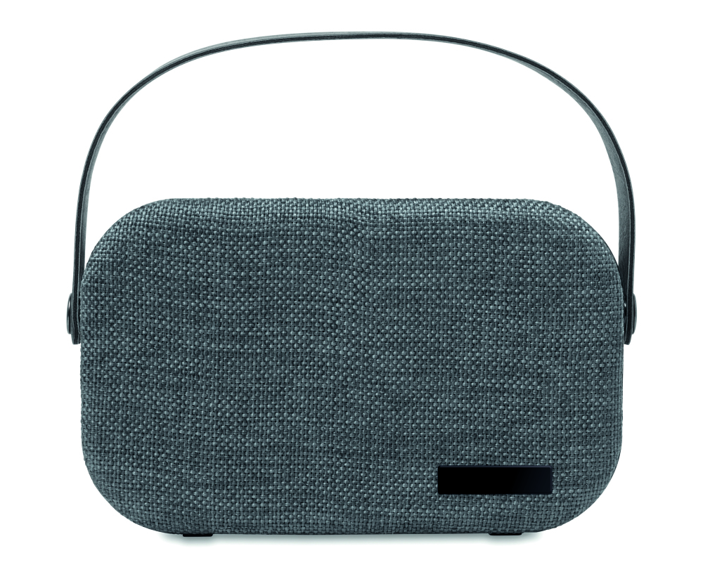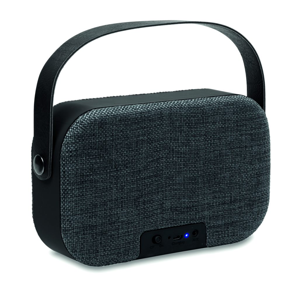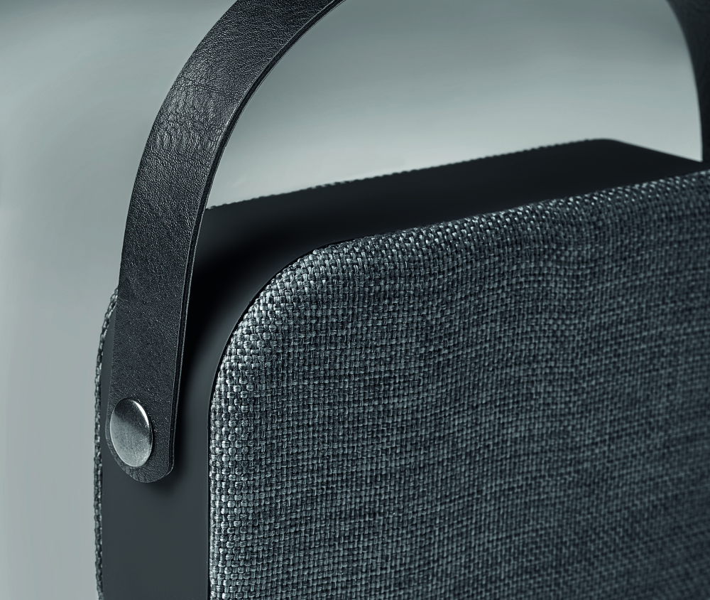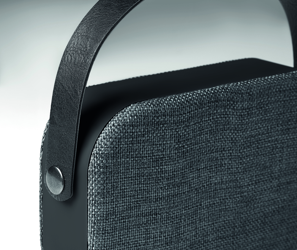 Głośnik Bluetooth 4.1 (2x3W) z wbudowanym wzmacniaczem. Akumulator litowo-jonowy 400 mAh. Uchwyt z PU ułatwia przenoszenie. Dołączony kabel ładowania USB. Nadruk na czarnej aluminiowej płytce.