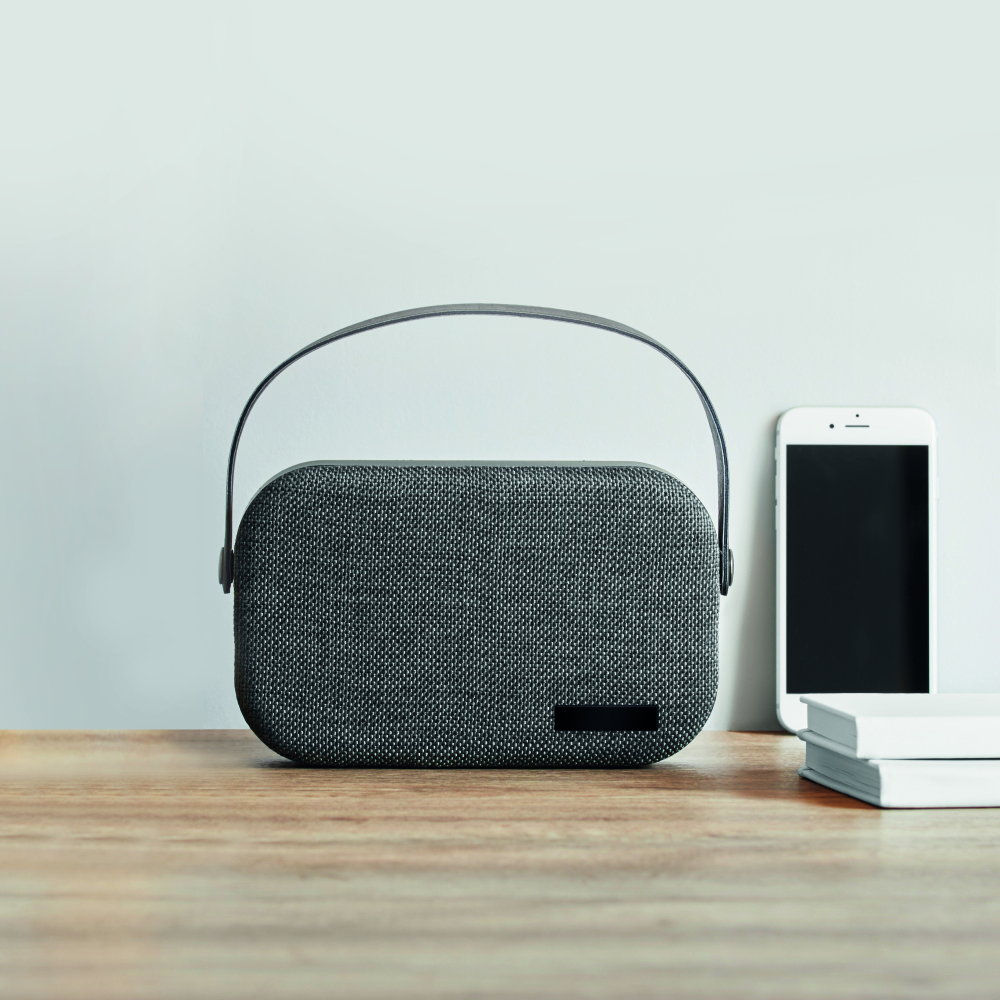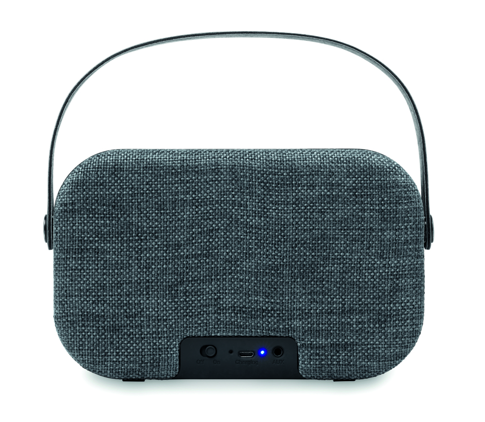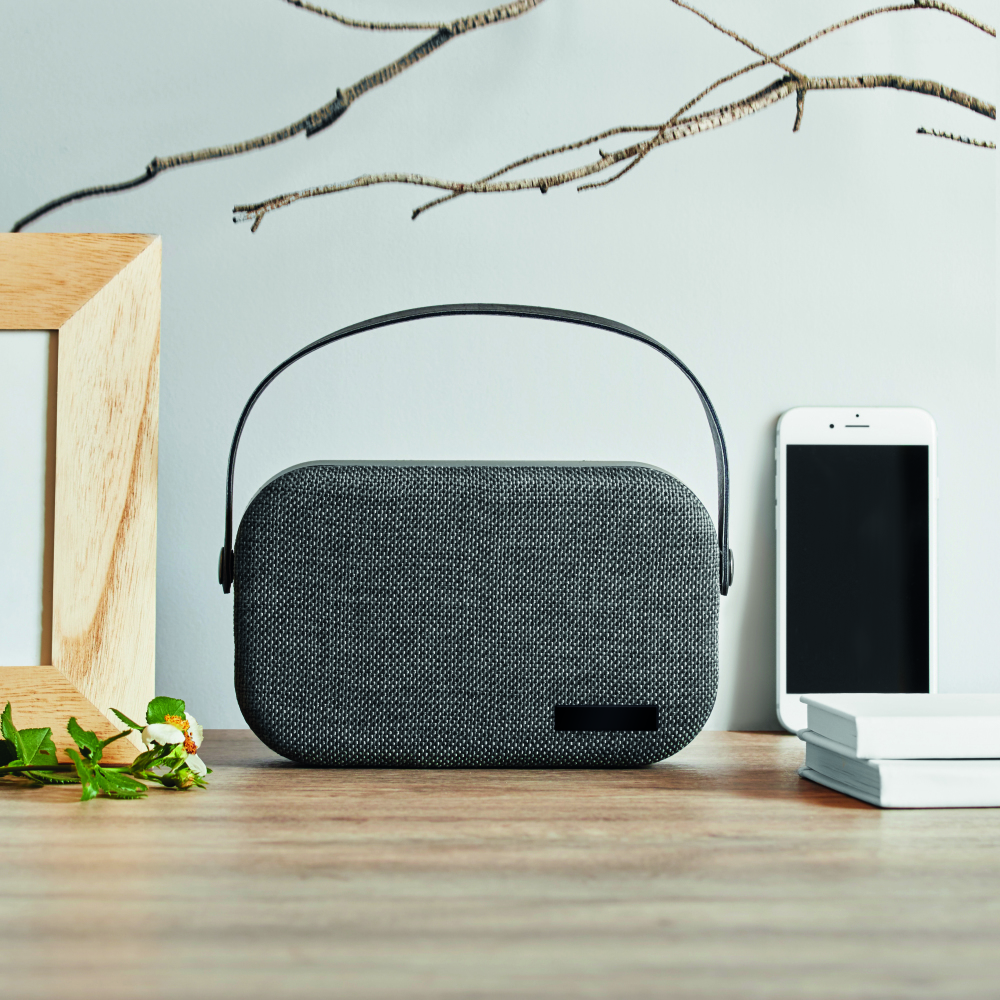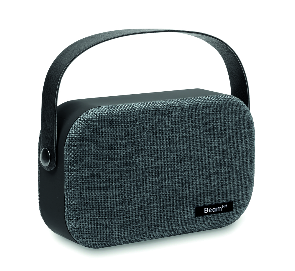 Głośnik Bluetooth 4.1 (2x3W) z wbudowanym wzmacniaczem. Akumulator litowo-jonowy 400 mAh. Uchwyt z PU ułatwia przenoszenie. Dołączony kabel ładowania USB. Nadruk na czarnej aluminiowej płytce.