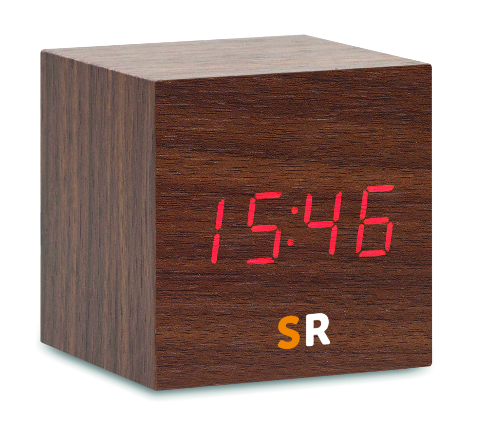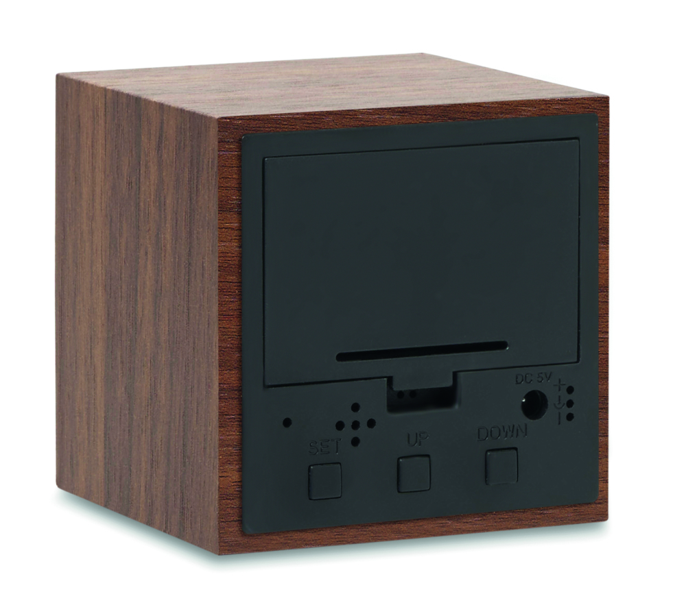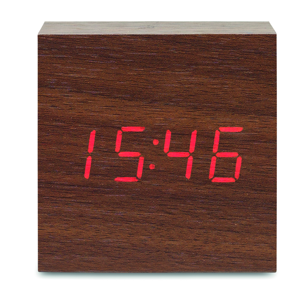 Zegar z wyświetlaczem LED. Wyświetlanie czasu i temperatury na płycie MDF. W zestawie adapter AC-DC z 2 wejściami. Nie nadaje się do użytku w Wielkiej Brytanii. 3 baterie AAA nie są dołączone.