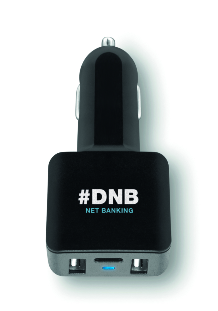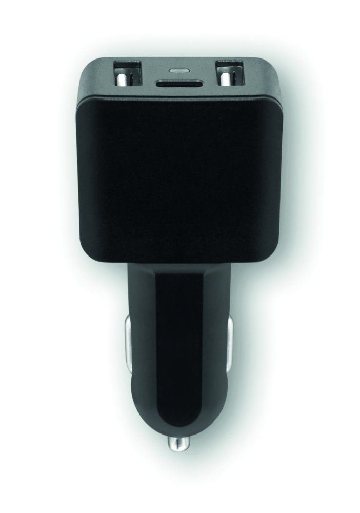 Ładowarka samochodowa USB posiada dwa wejścia na ładowanie oraz port typu C. Ładowarka została wykonana z plastiku, dostępna w kolorze czarnym.
