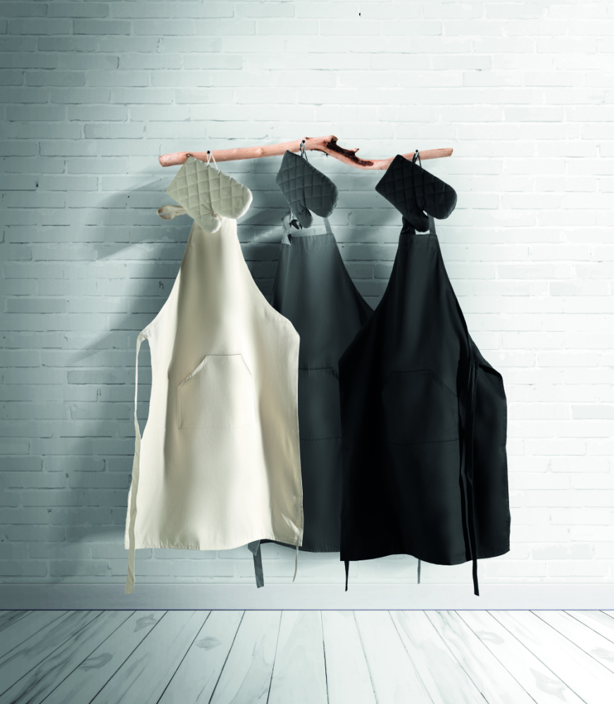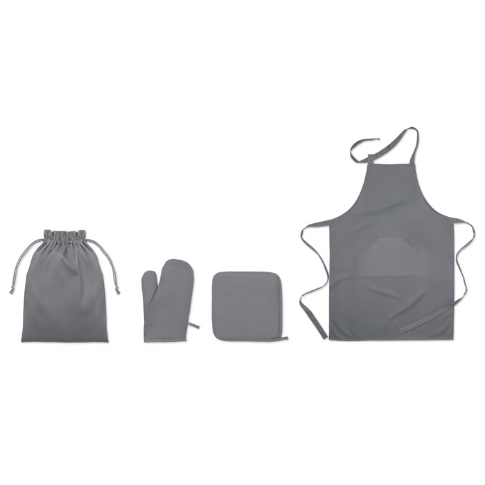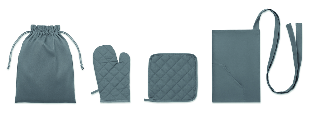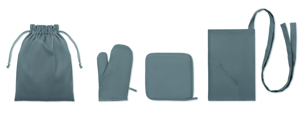 Zestaw kuchenny z bawełny twill 250g/m2. Fartuch, ściereczka do trzymania gorących garnków oraz rękawica kuchenna. Wszystko zapakowane w kolorystycznie dobrany woreczek.