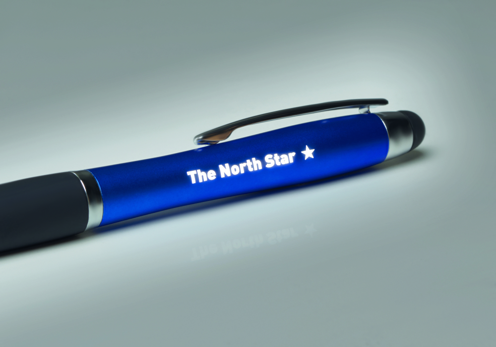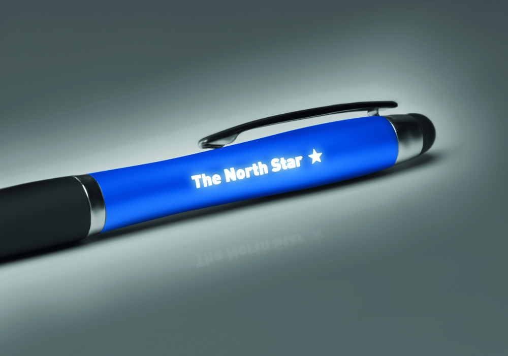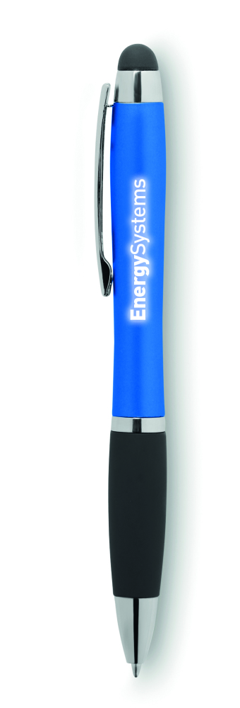 Przekręcany długopis z ABS z miękkim uchwytem, końcówką do ekranów dotykowych oraz wbudowaną lampką podświetlającą wygrawerowane logo. Logo naniesione tampondrukiem nie jest podświetlane. Włączanie poprzez naciśnięcie miękkiej końcówki. Dołączone 3 baterie AG3.