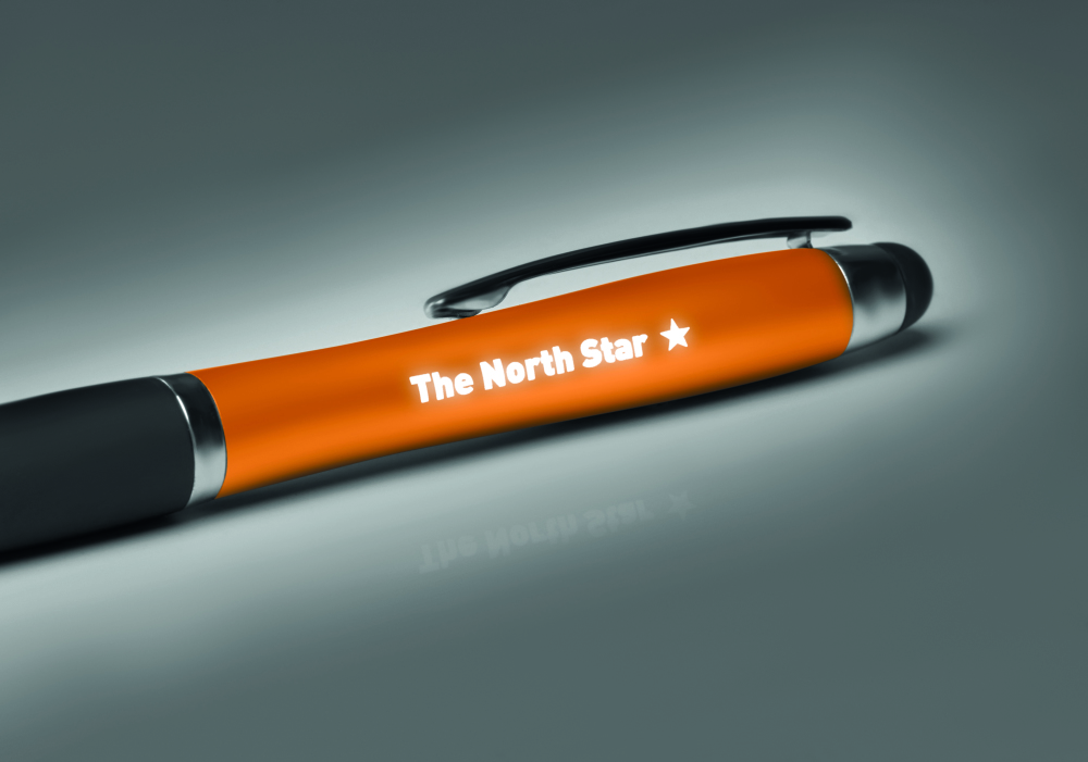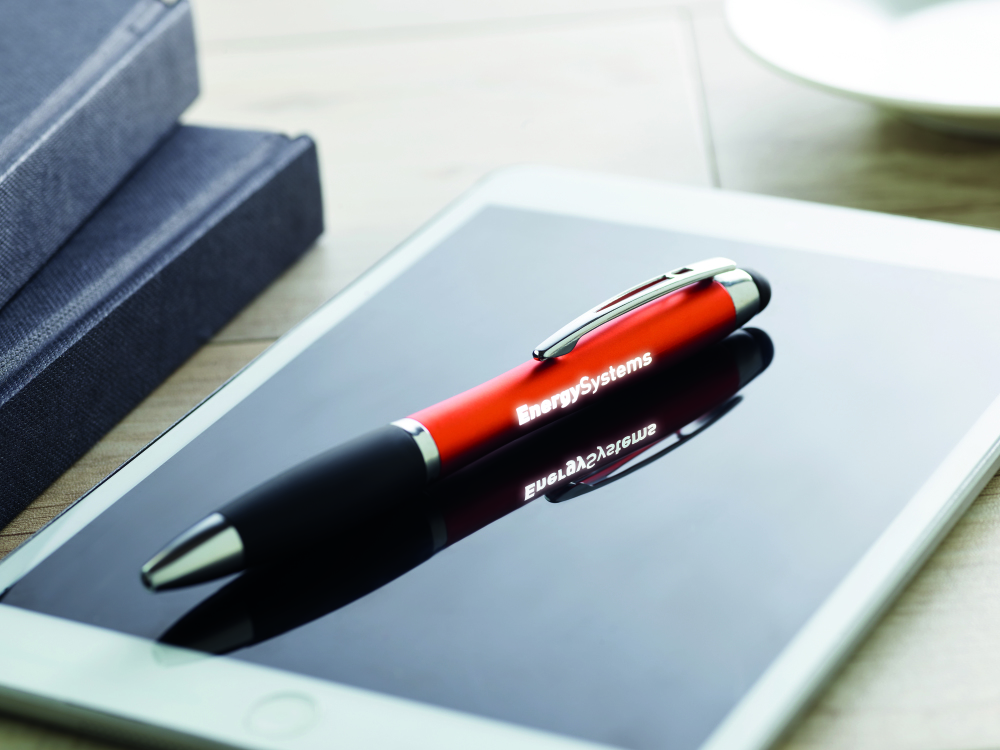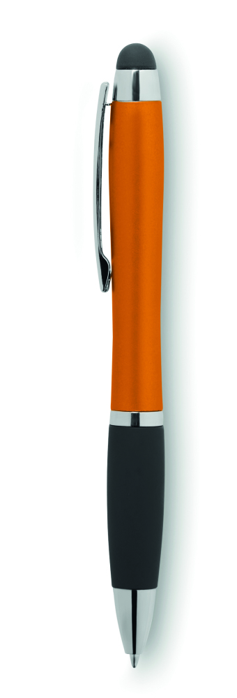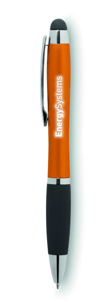 Przekręcany długopis z ABS z miękkim uchwytem, końcówką do ekranów dotykowych oraz wbudowaną lampką podświetlającą wygrawerowane logo. Logo naniesione tampondrukiem nie jest podświetlane. Włączanie poprzez naciśnięcie miękkiej końcówki. Dołączone 3 baterie AG3.