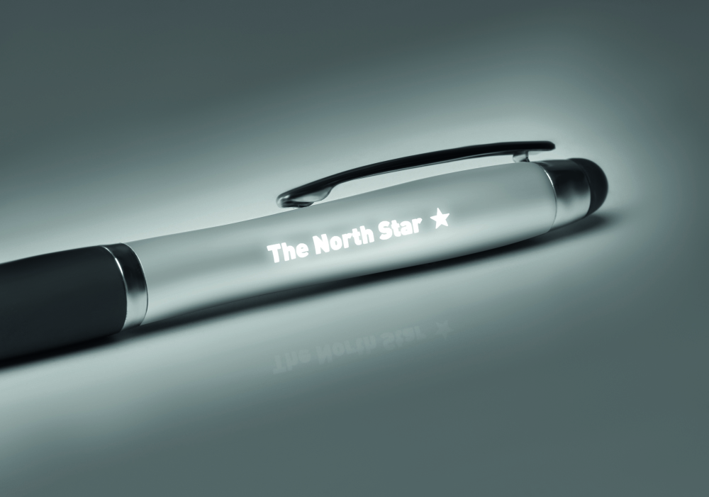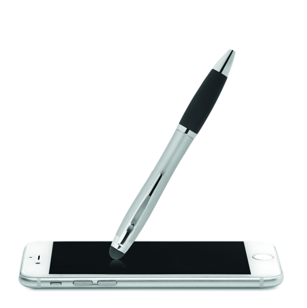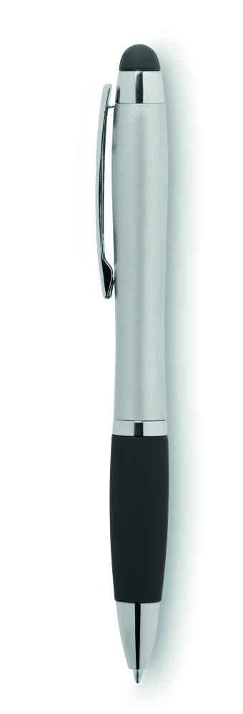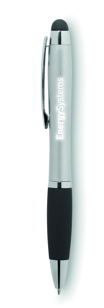 Przekręcany długopis z ABS z miękkim uchwytem, końcówką do ekranów dotykowych oraz wbudowaną lampką podświetlającą wygrawerowane logo. Logo naniesione tampondrukiem nie jest podświetlane. Włączanie poprzez naciśnięcie miękkiej końcówki. Dołączone 3 baterie AG3.