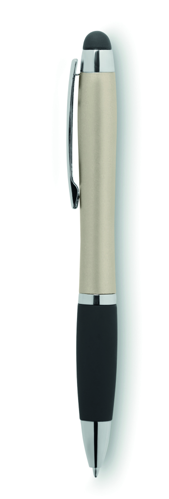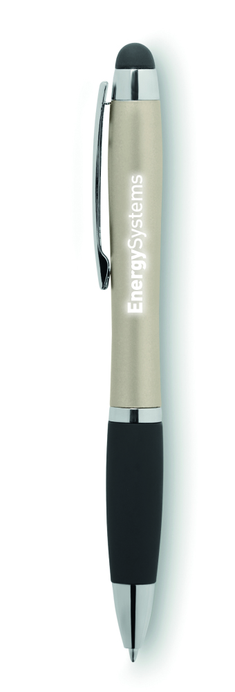 Przekręcany długopis z ABS z miękkim uchwytem, końcówką do ekranów dotykowych oraz wbudowaną lampką podświetlającą wygrawerowane logo. Logo naniesione tampondrukiem nie jest podświetlane. Włączanie poprzez naciśnięcie miękkiej końcówki. Dołączone 3 baterie AG3.
