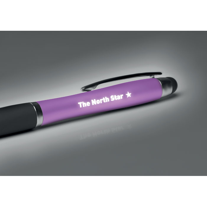 Przekręcany długopis z ABS z miękkim uchwytem, końcówką do ekranów dotykowych oraz wbudowaną lampką podświetlającą wygrawerowane logo. Logo naniesione tampondrukiem nie jest podświetlane. Włączanie poprzez naciśnięcie miękkiej końcówki. Dołączone 3 baterie AG3.