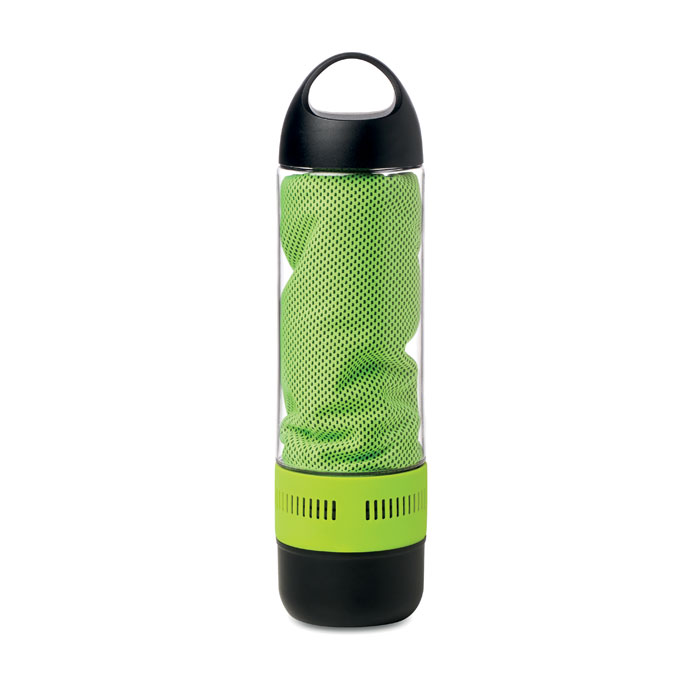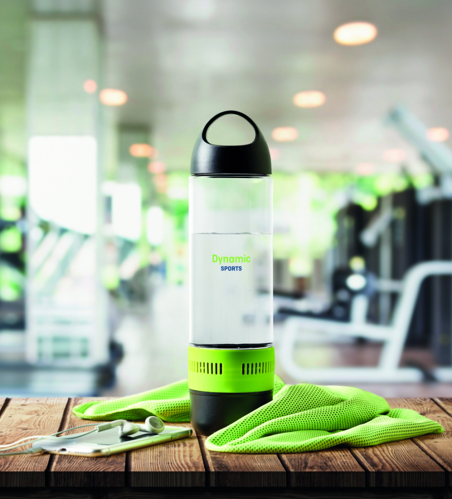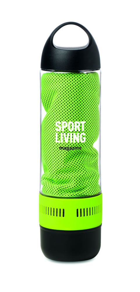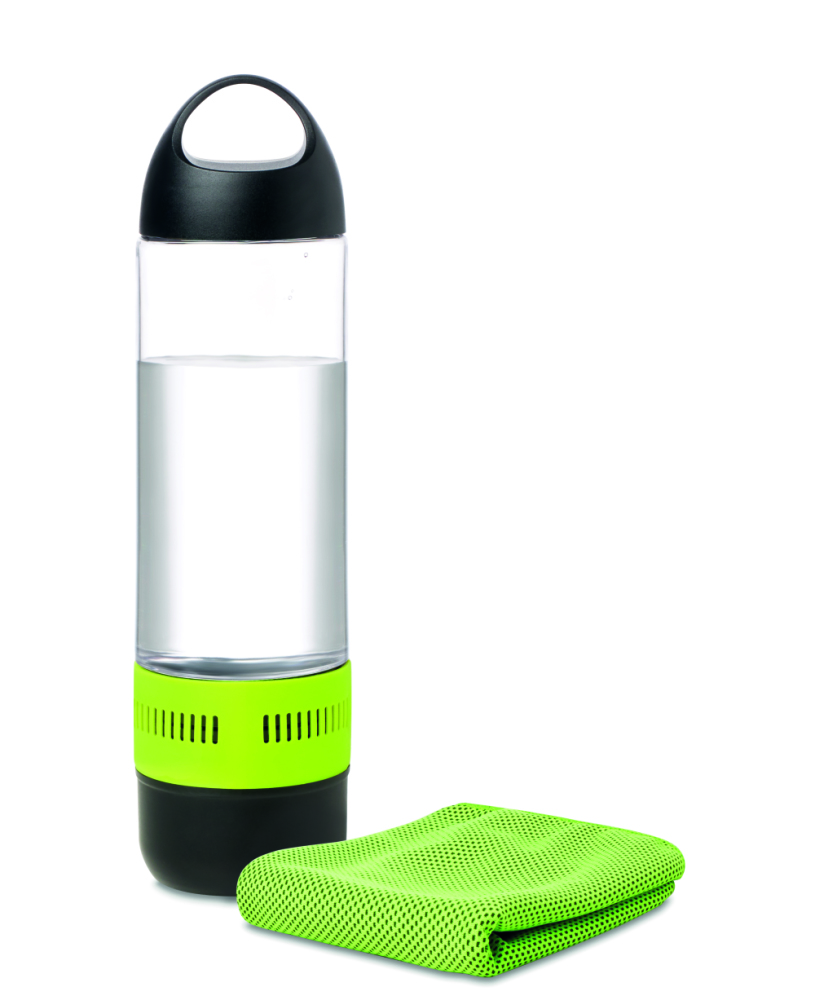 Bezprzewodowy głośnik - butelka 500ml. Zawiera ręcznik 55% poliestru (30x80cm). Dołączona bateria Li-on 300mAh oraz kabel micro USB. Dane wyjściowe: 3W.