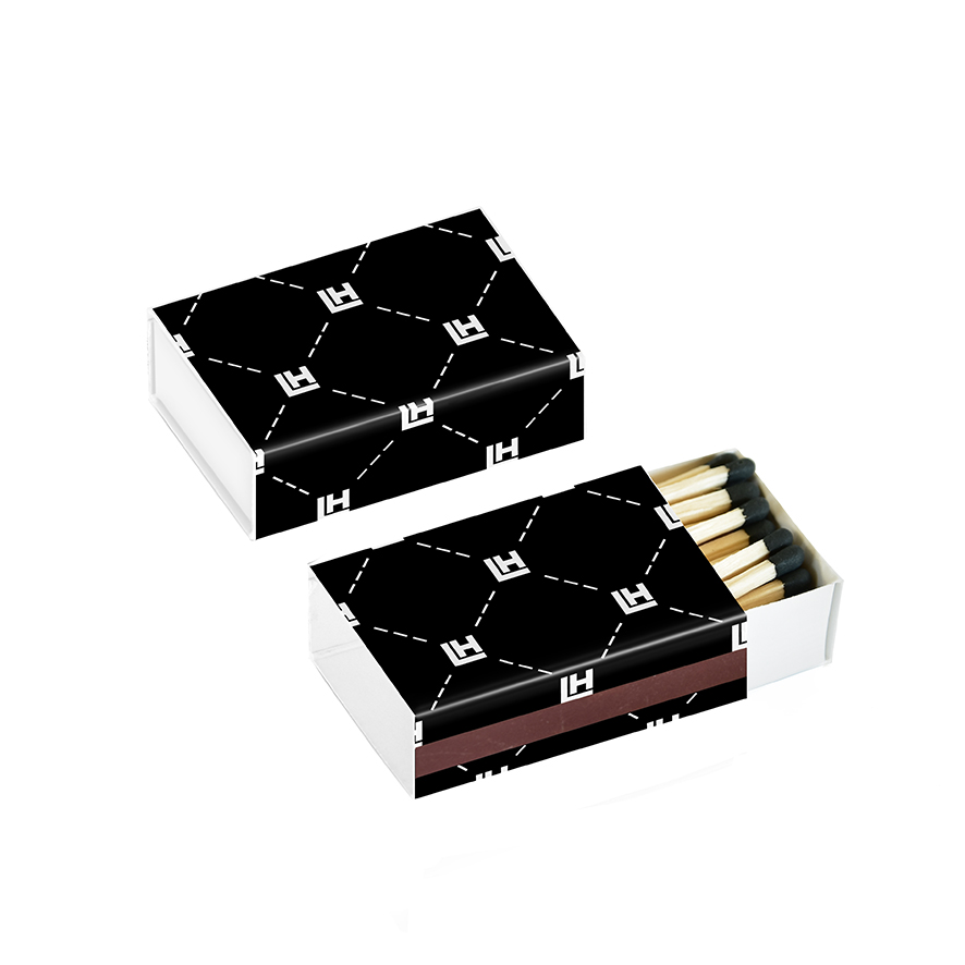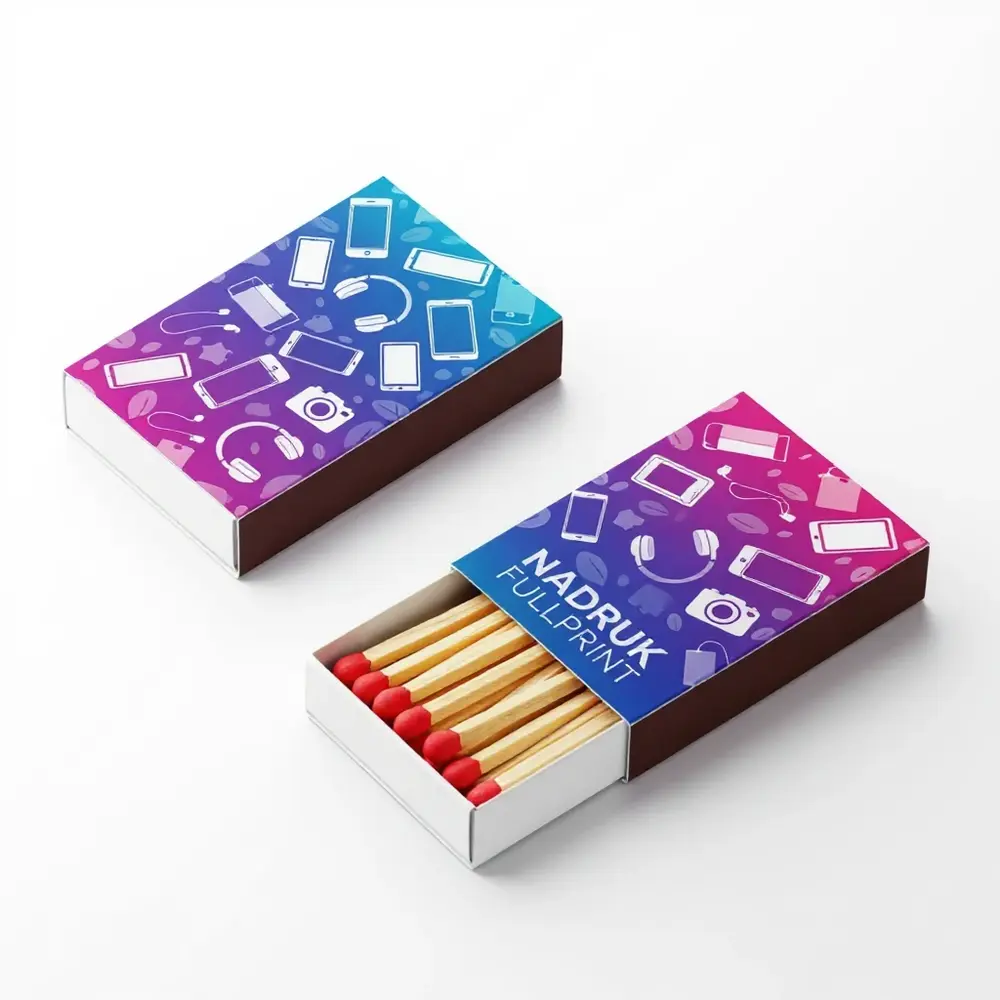 Zapałki reklamowe w klasycznym opakowaniu z wysuwaną szufladką oraz potarką po obu stronach.