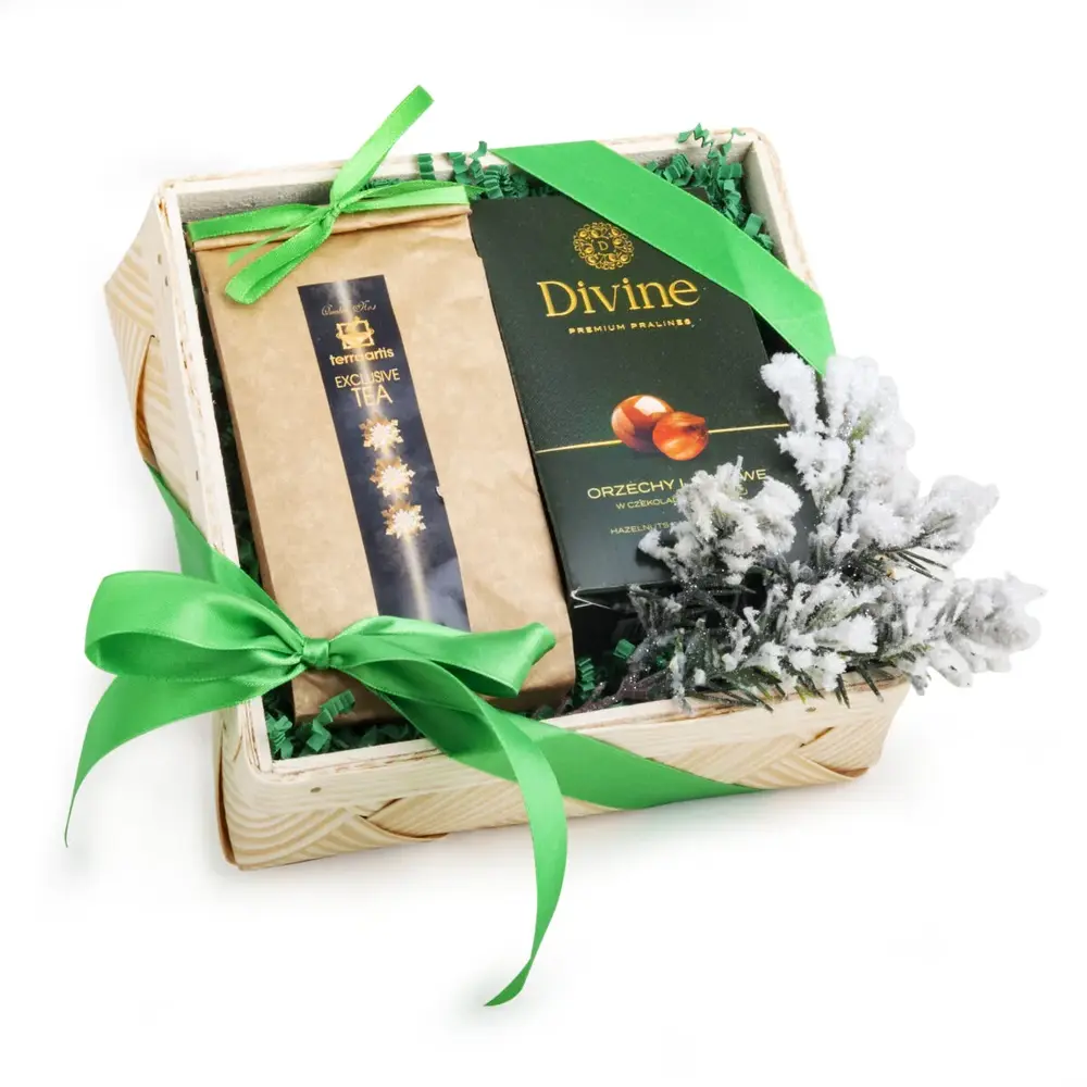 Mały zestaw w wiklinowym koszyczku, z wypełnieniem i świąteczną dekoracją.