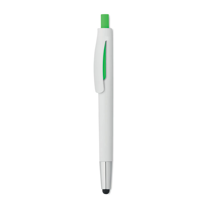 Wciskany plastikowy długopis z końcówką do ekranów dotykowych. Wykonany z ABS. Niebieski wkład.
