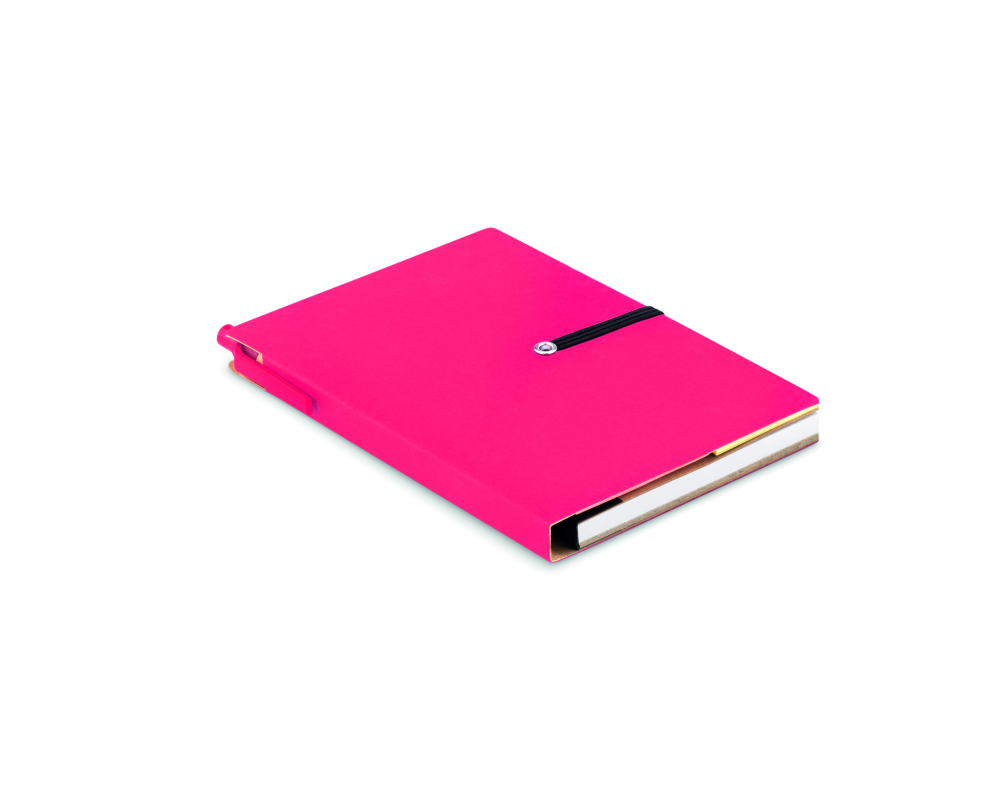 Notes z recyklingu, 70 stron w linie, karteczki oraz znaczniki samoprzylepne. Posiada elastyczną taśmę oraz kartonowy długopis z elementami z ABS oraz czarnym wkładem.