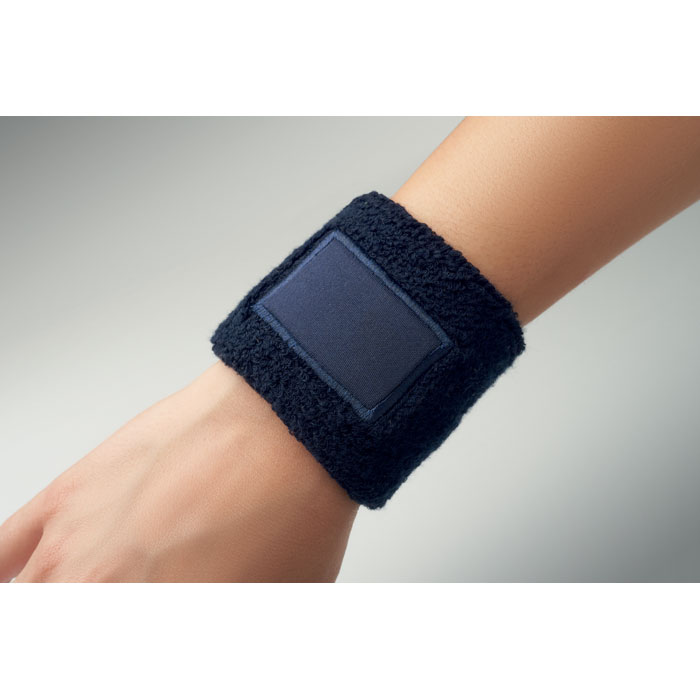 Opaska na nadgarstek z polibawełny (79%cotton/13%elastic/8% poliester) z bawełnianą naszywką w miejscu nadruku.