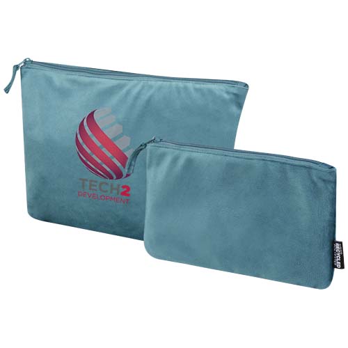 Zestaw 2 kosmetyczek wykonanych z certyfikowanego przez GRS aksamitnego poliestru pochodzącego z recyklingu. Zestaw zawiera jedną dużą i jedną małą saszetkę umożliwiającą uporządkowane przechowywanie. Lekkie, trwałe i łatwe do spakowania. Duża torba ma wymiary 32 x 21 cm, mała torba ma wymiary 23 x 13 cm.