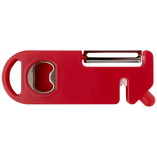 To wielofunkcyjne narzędzie kuchenne łączy w sobie cztery podstawowe funkcje w jednej kompaktowej konstrukcji. Wykonane z tworzyw sztucznych pochodzących z recyklingu, zawiera obieraczkę, otwieracz do butelek, ostrzałkę do noży i spiczastą końcówkę do usuwania oczek z ziemniaków. Wbudowany otwór do zawieszania umożliwia łatwe przechowywanie. Praktyczne i oszczędzające miejsce, jest uniwersalnym, niezbędnym gadżetem każdego domowego kucharza.