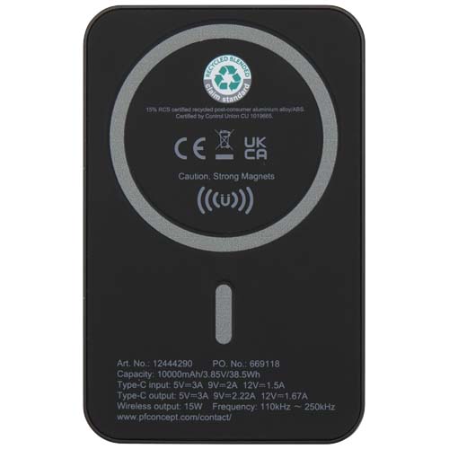 Acrab magnetyczny bezprzewodowy powerbank o pojemności 10 000 mAh i mocy 15 W z technologią 20 W PD — wykonany z tworzyw sztucznych pochodzących z recyklingu / Czarny