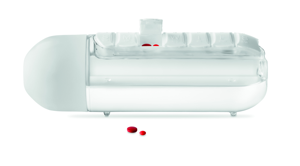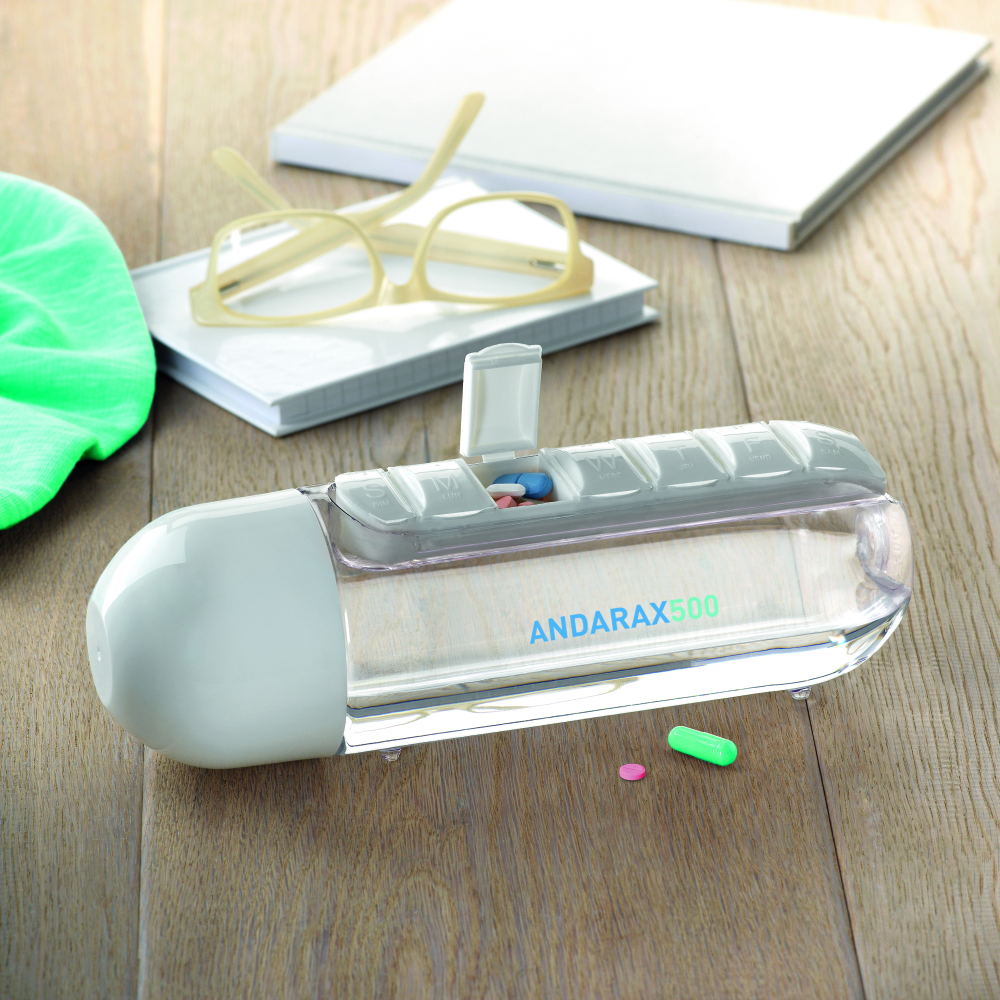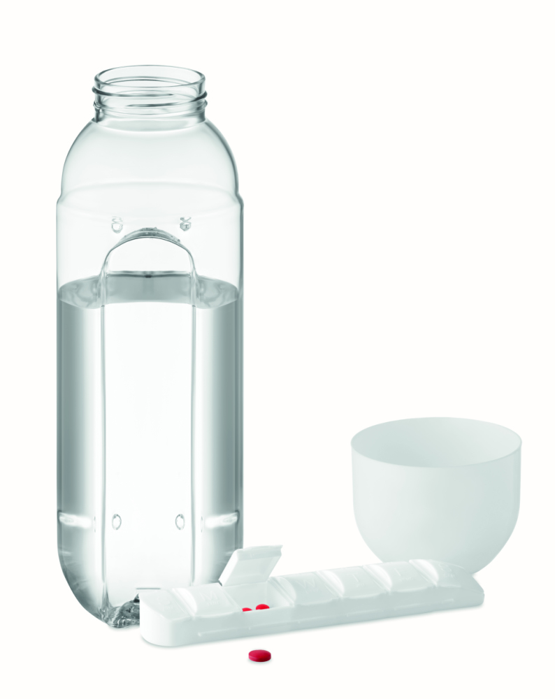 Butelka o pojemności 600 ml posiada dodatkowo odczepiany pojemnik z 7 przegródkami, w których można umieścić witaminy, suplementy czy inne drobne leki.