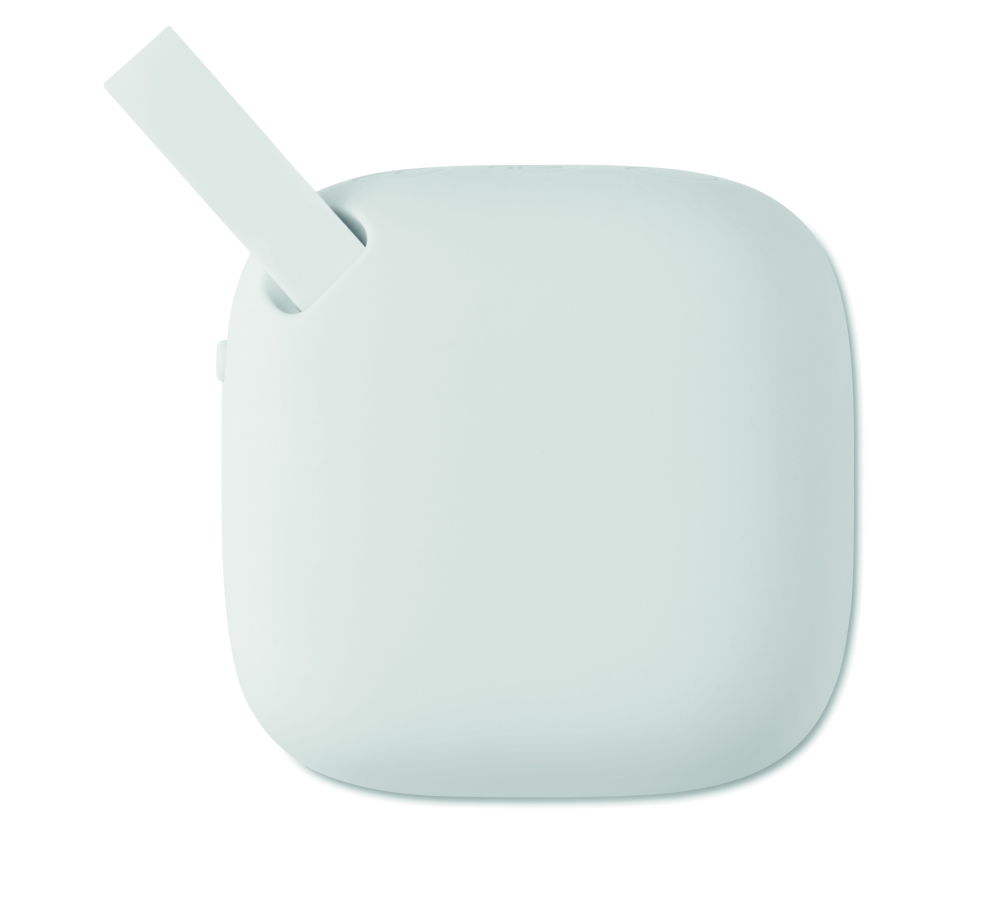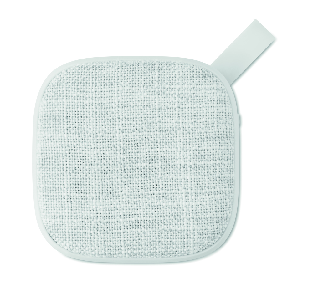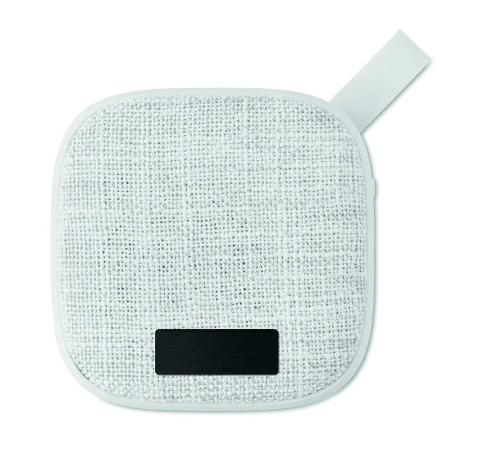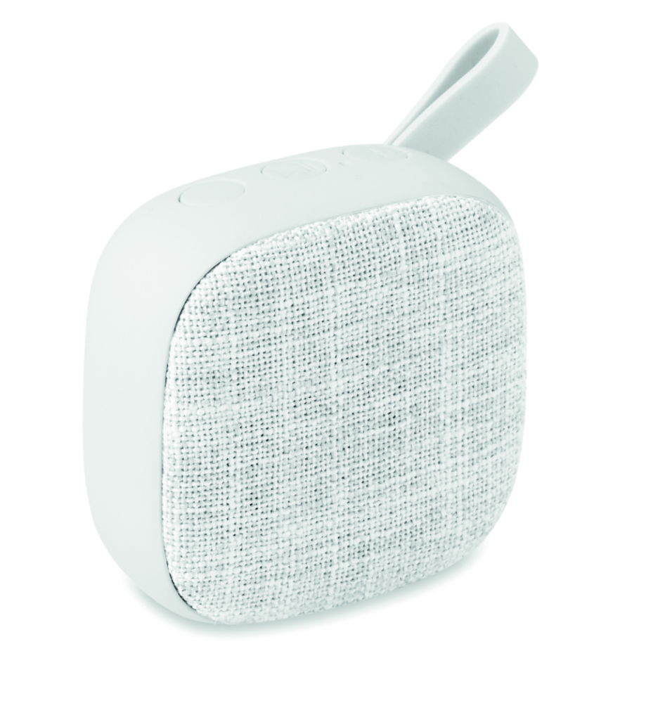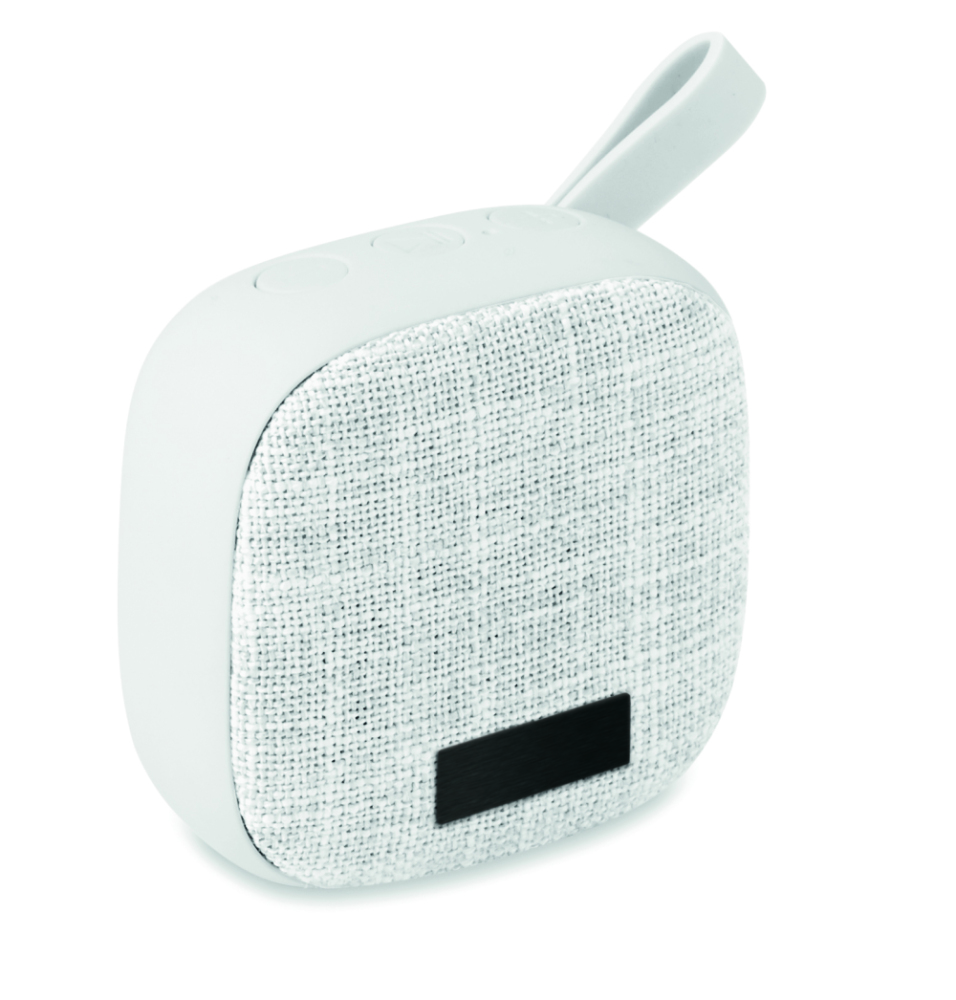 Głośnik bluetooth z gumowym wykończeniem oraz przednią częścią z tkaniny. Posiada czarną aluminiową tabliczkę do naniesienia logo. Bateria litowo-jonowa 300mAh.