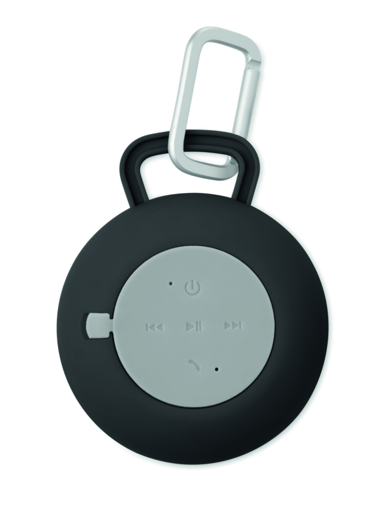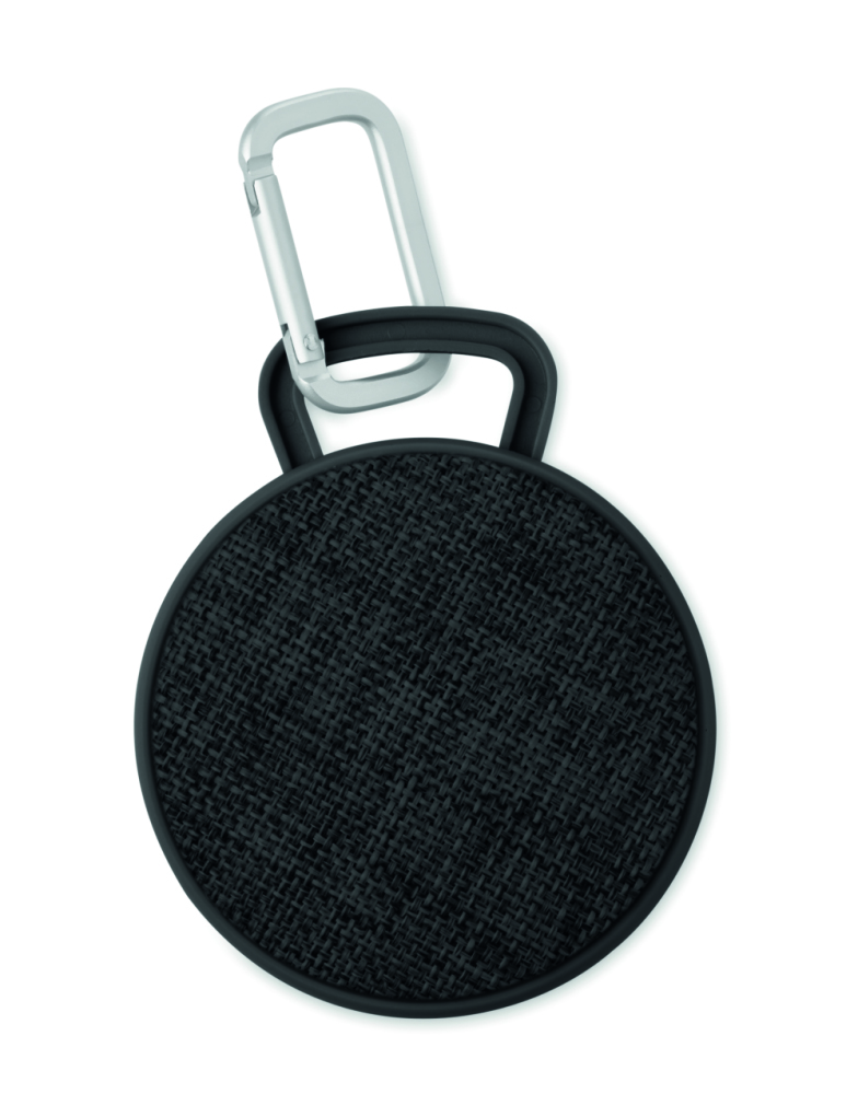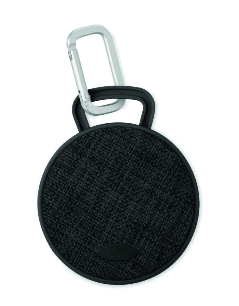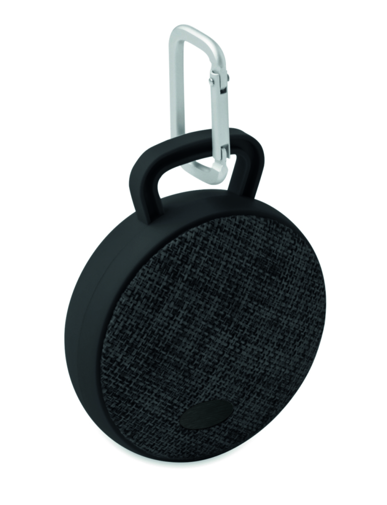 Głośnik bluetooth z wykończeniem z tkaniny na przedniej części i gumowanymi elementami. Posiada czarną aluminiową tabliczkę do naniesienia logo. Bateria litowo-jonowa 300 mAh.