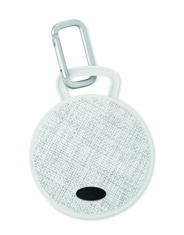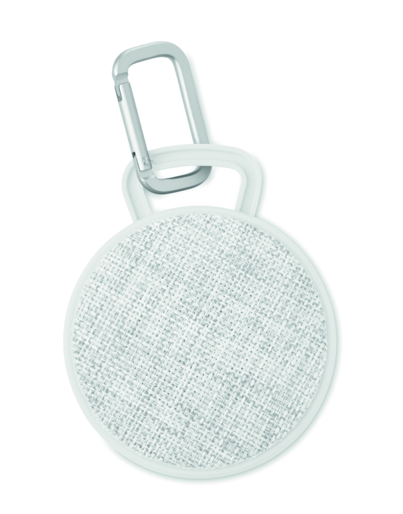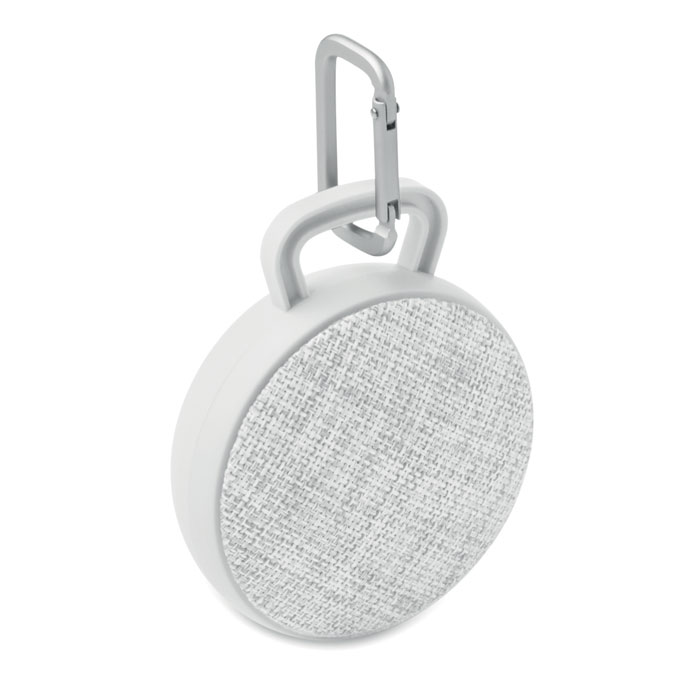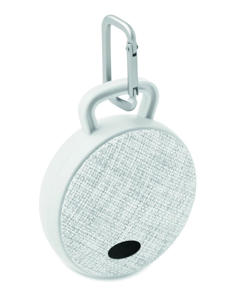 Głośnik bluetooth z wykończeniem z tkaniny na przedniej części i gumowanymi elementami. Posiada czarną aluminiową tabliczkę do naniesienia logo. Bateria litowo-jonowa 300 mAh.