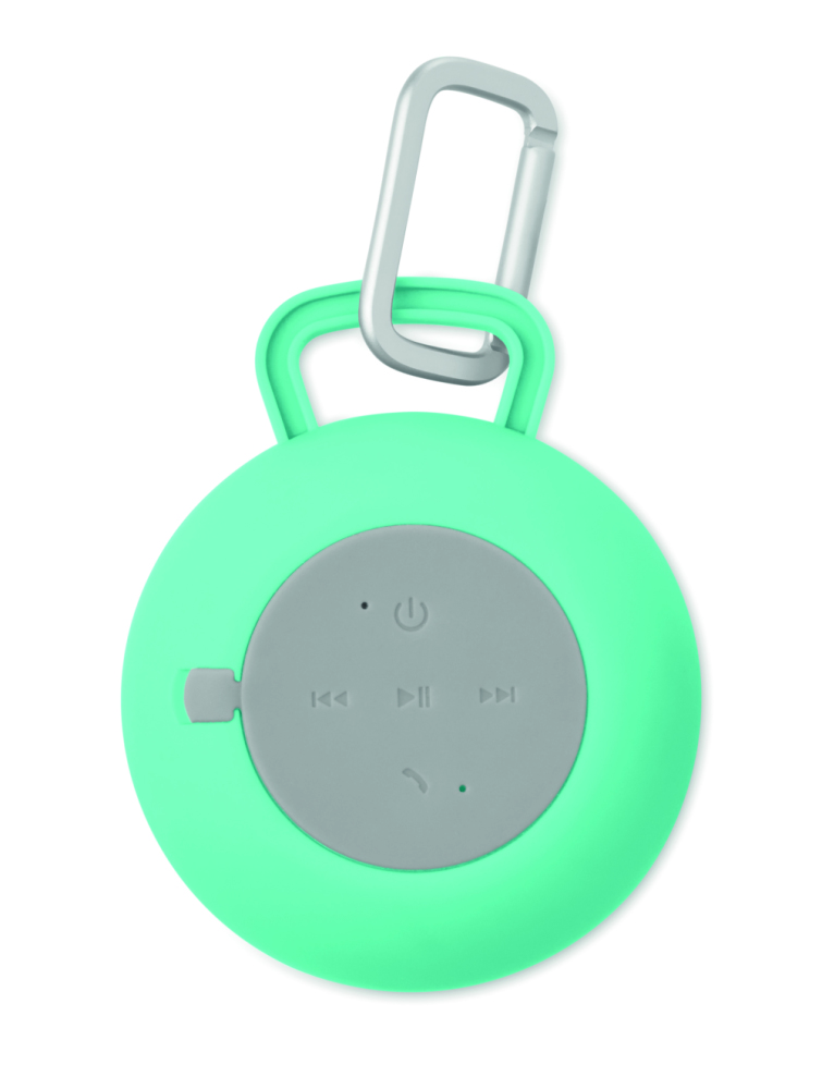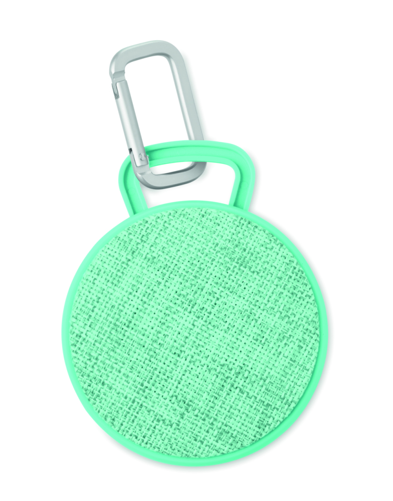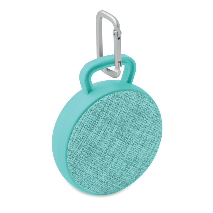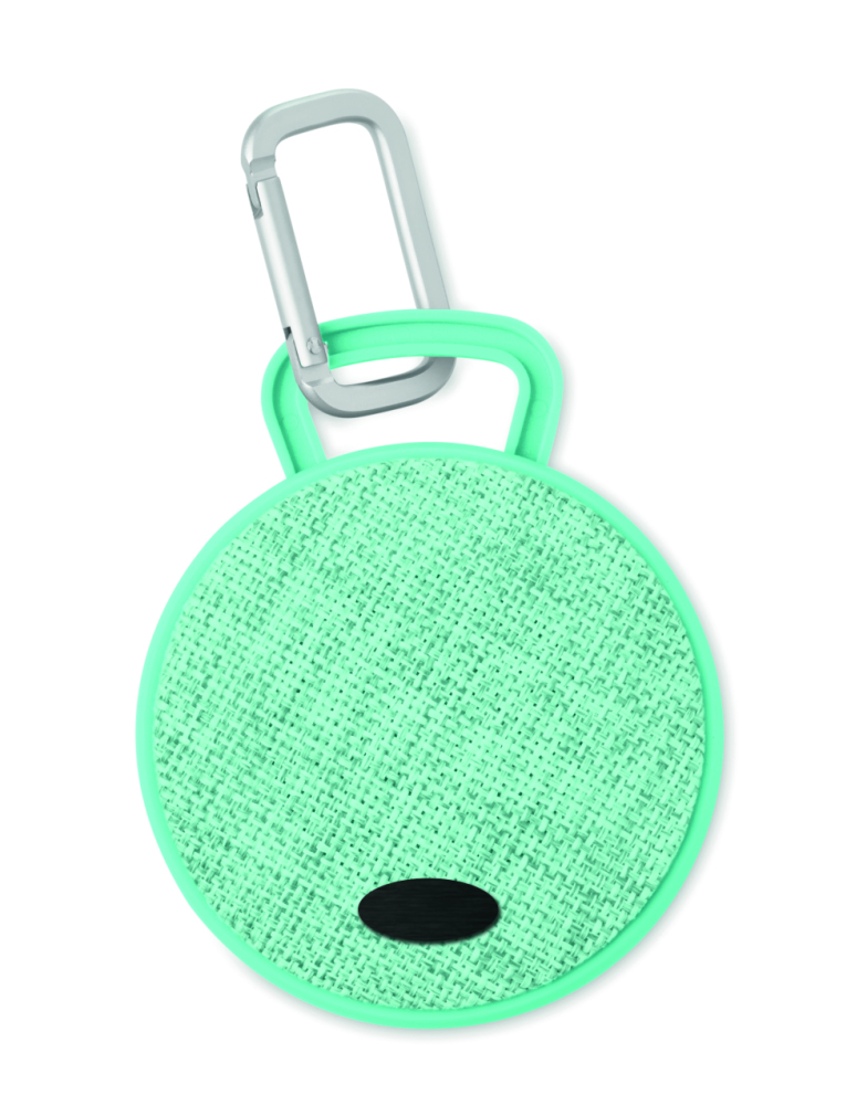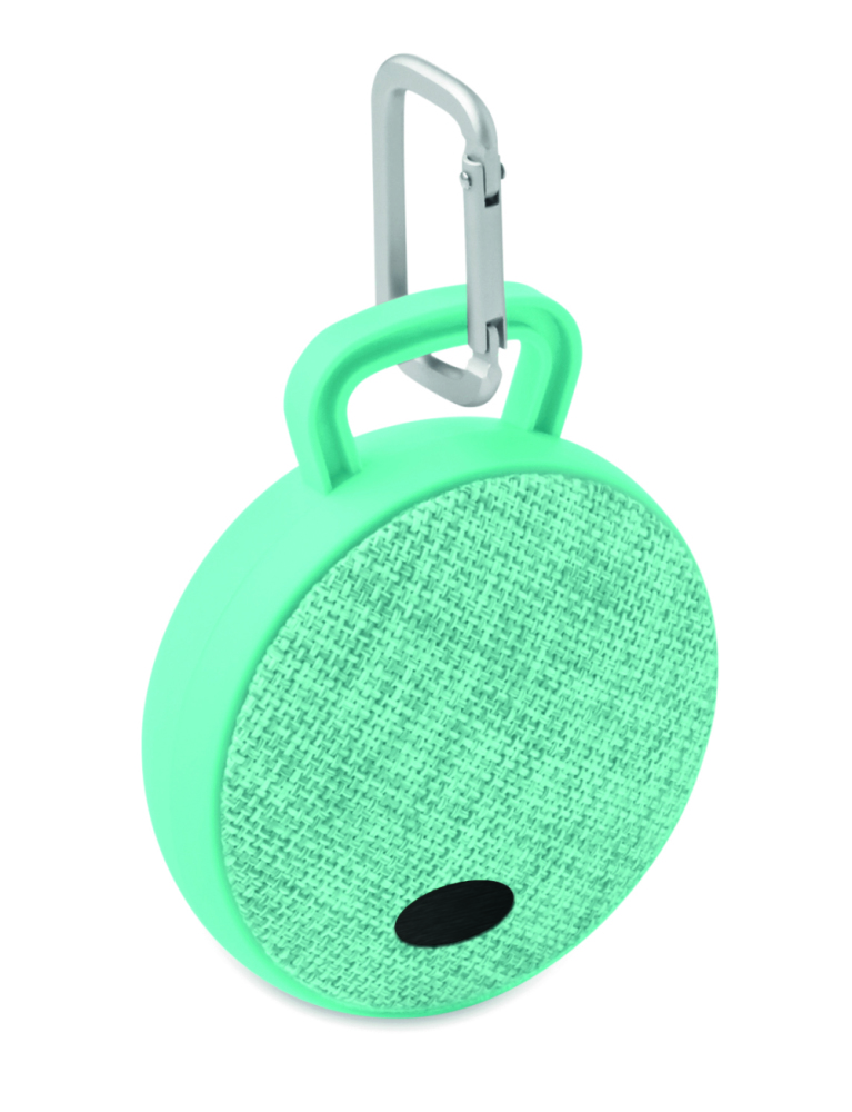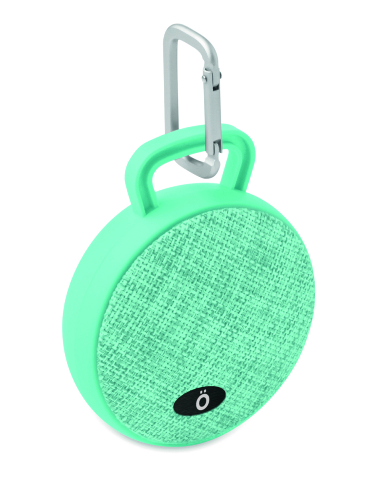 Głośnik bluetooth z wykończeniem z tkaniny na przedniej części i gumowanymi elementami. Posiada czarną aluminiową tabliczkę do naniesienia logo. Bateria litowo-jonowa 300 mAh.