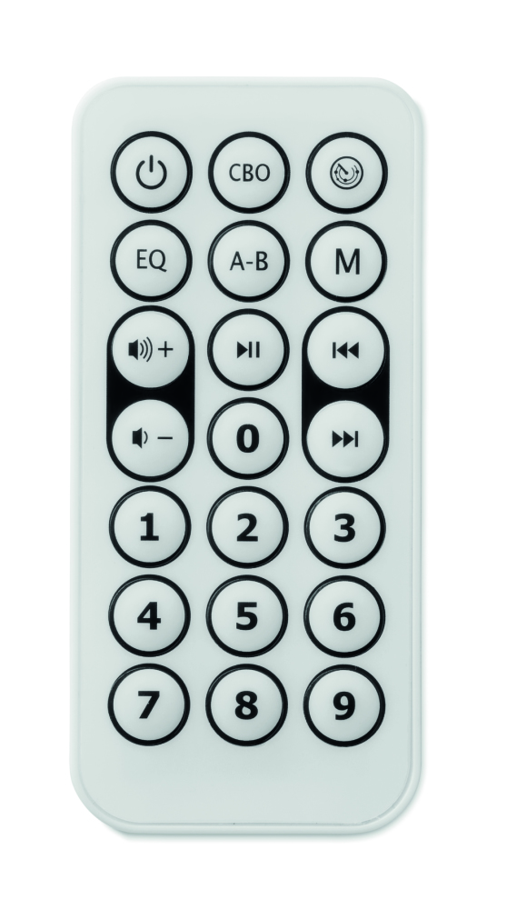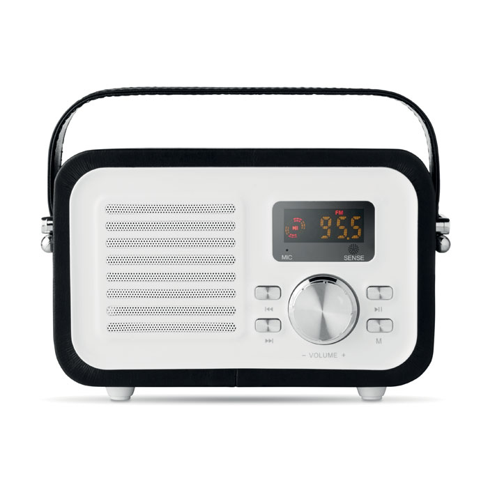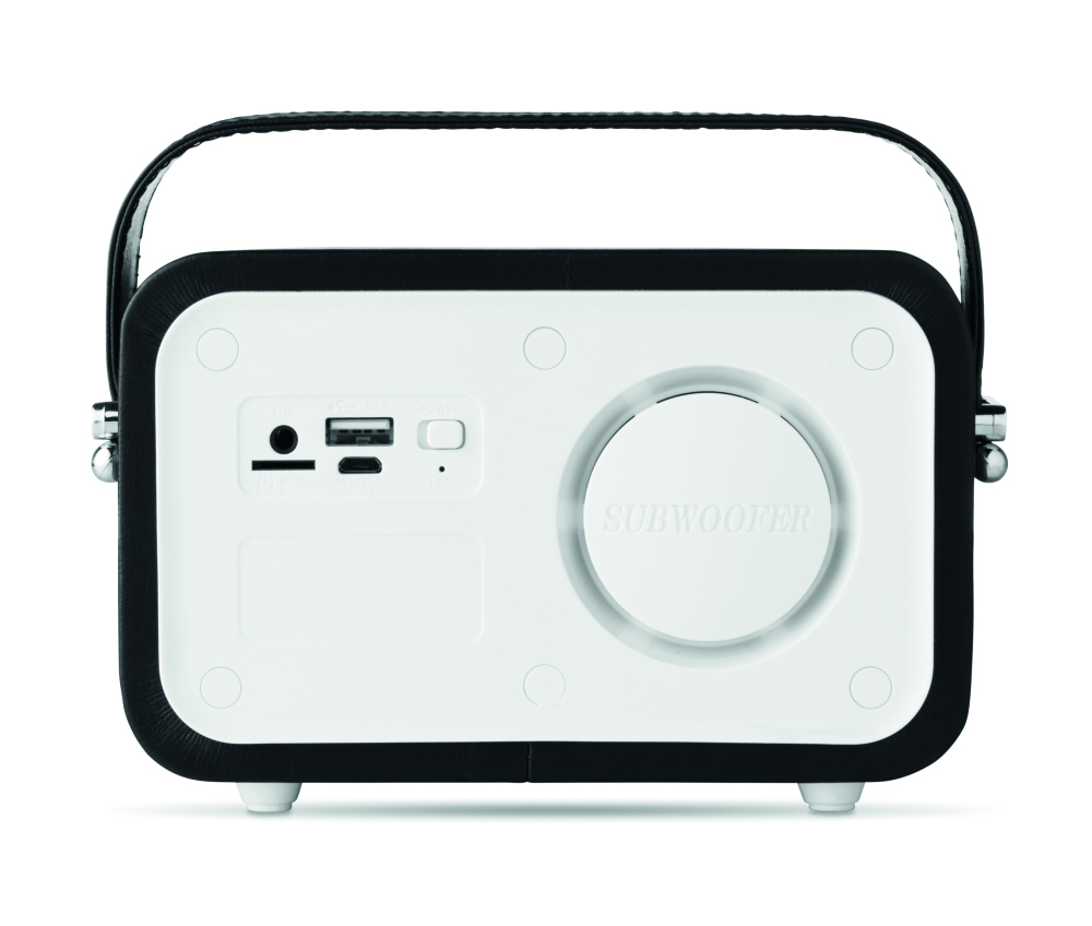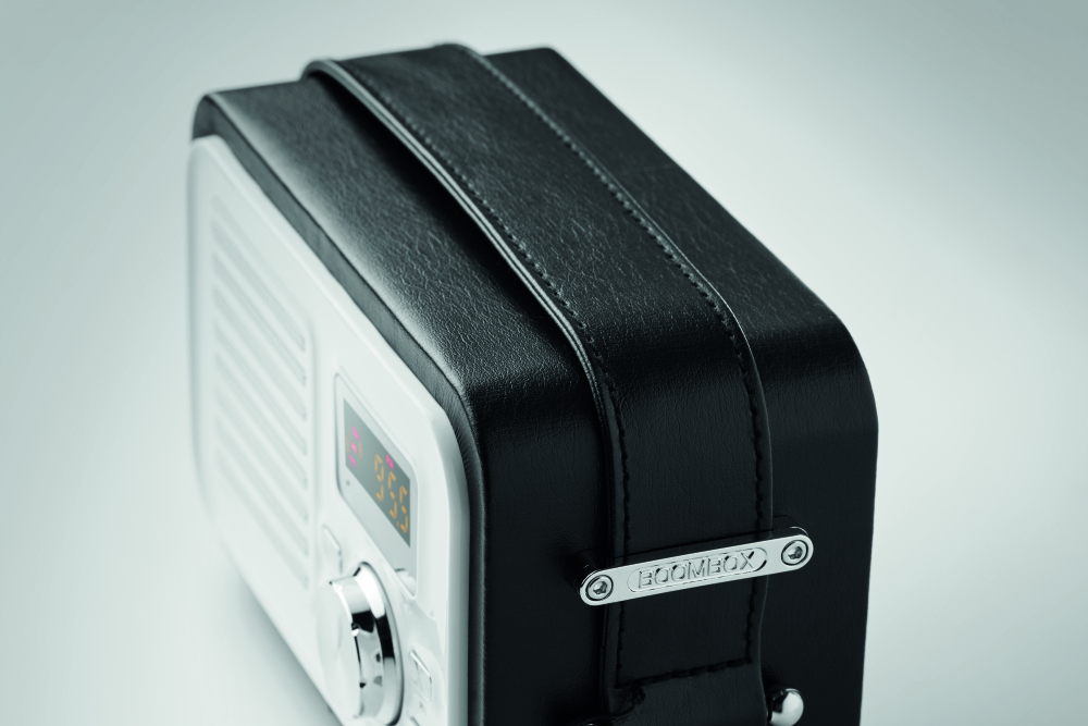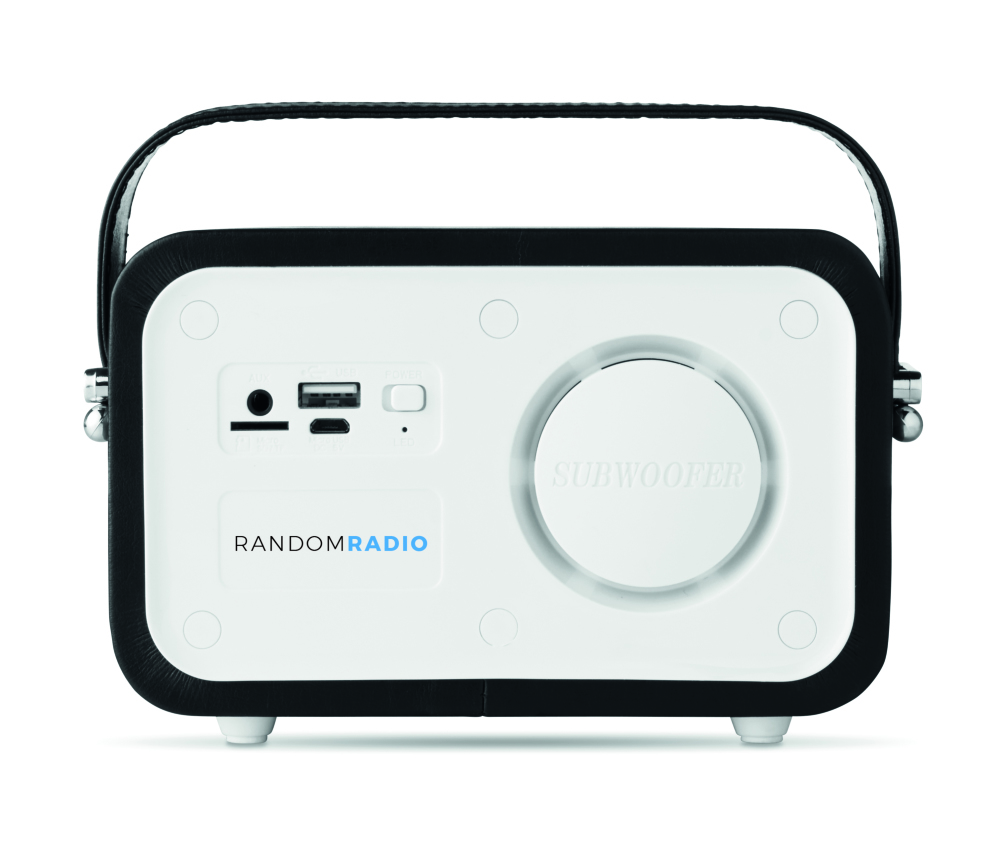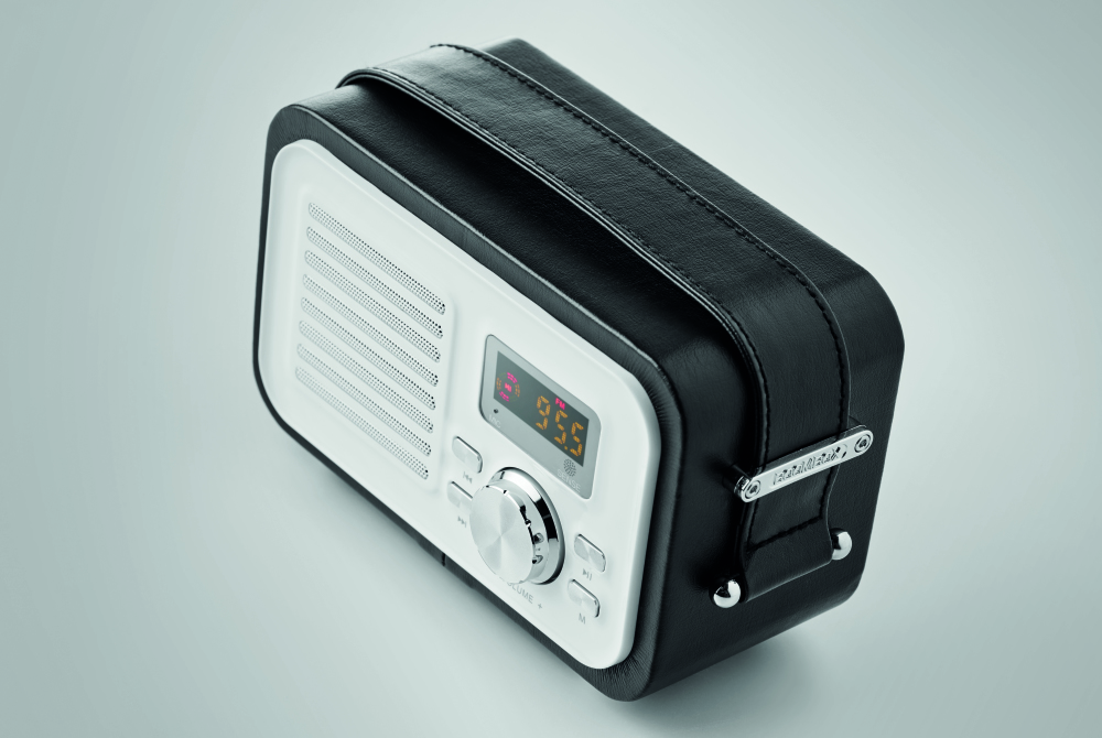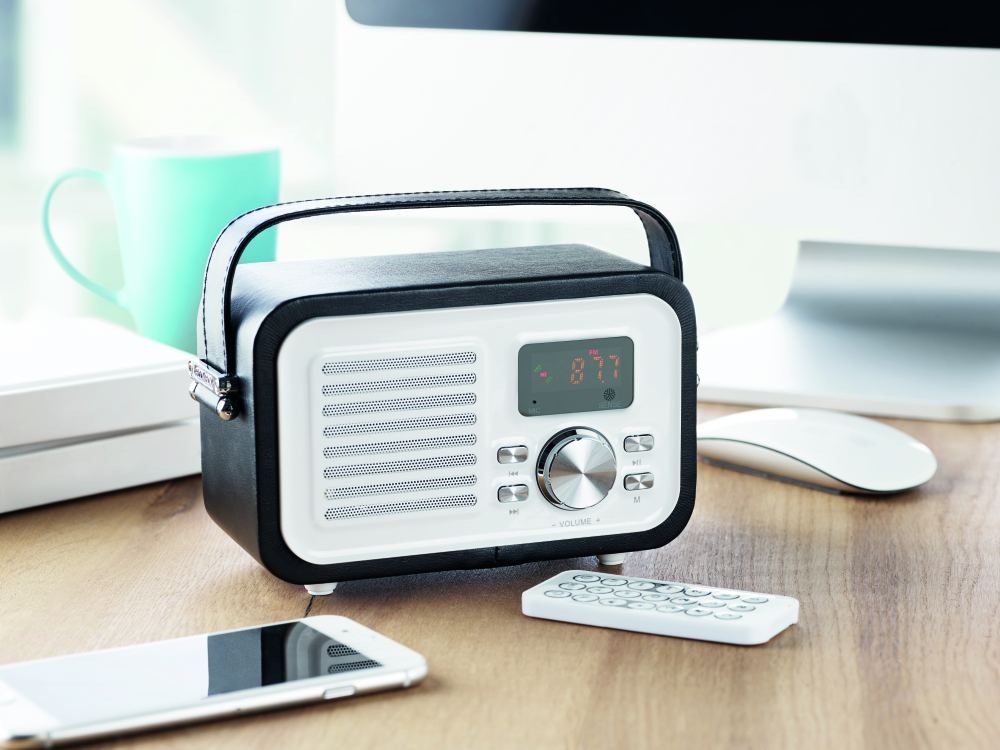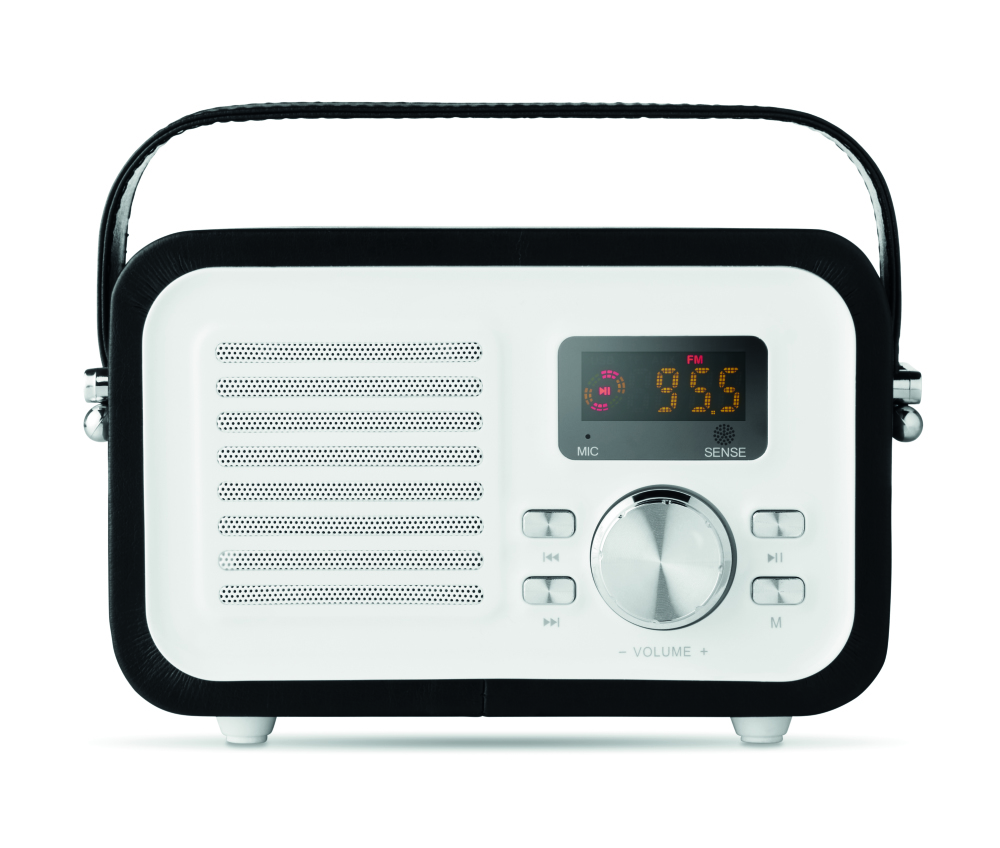 Głośnik bluetooth 5W z radiem, wykończenie z PU. Posiada gniazdo Micro SD, auto skan i pamięć. Odbiornik posiada akumulator 1200 mAh oraz pilot zasilany baterią CR2025 (w zestawie).
