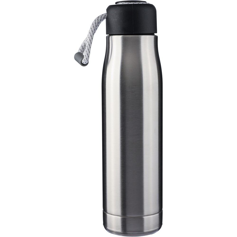 Butelka termiczna 500 ml ze stali nierdzewnej, podwójne ścianki ze stali nierdzewnej z próżnią między ściankami dzięki czemu zachowuje funkcje termosu i długo utrzymuje temperaturę nie oddając jej na zewnątrz, zewnętrzna część wykonana jest ze stali nierdzewnej 201, a wewnętrzna ścianka ze stali nierdzewnej 304, wieczko z PP, sznurek ułatwiający noszenie, ikona recyklingu na produkcie, zapakowana w brązowe kartonowe pudełko