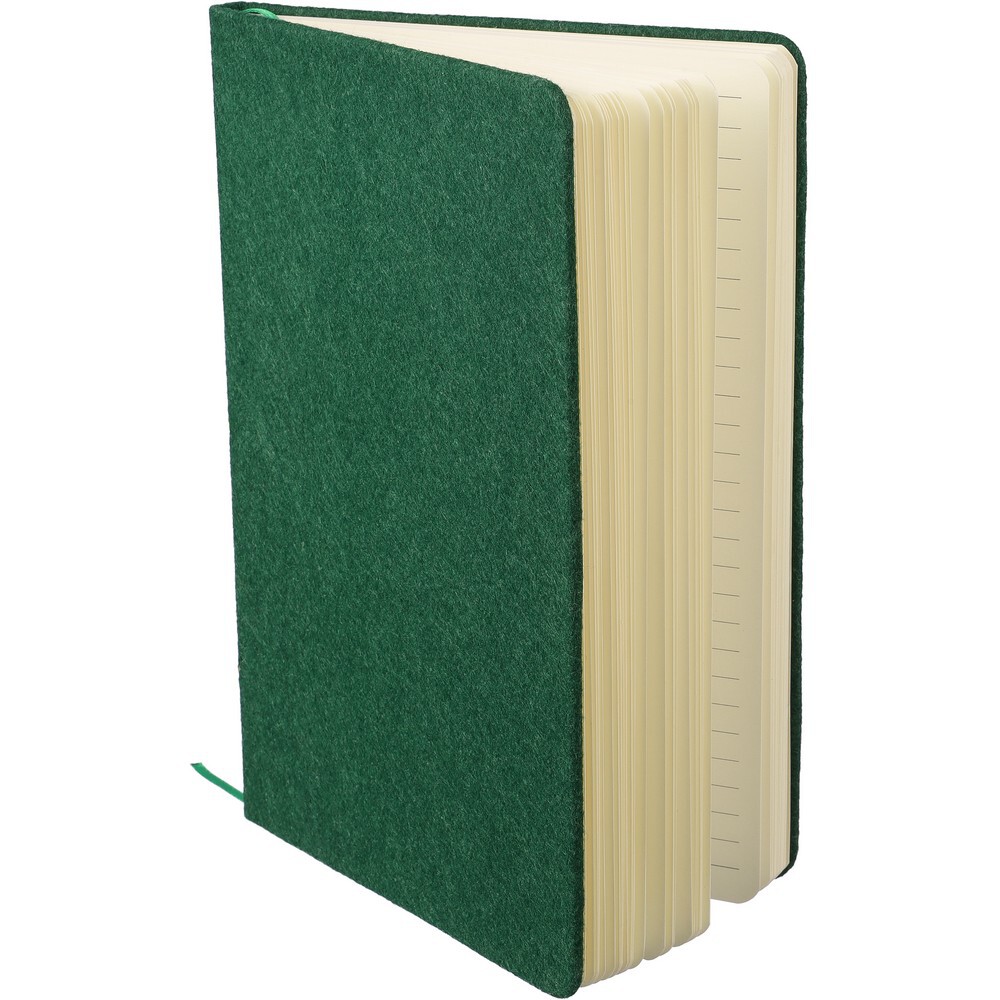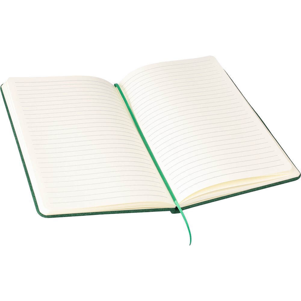 Notatnik ok. A5, 80 kartek w linie (70 g/m²) z zewnętrznym paskiem zamykającym, miękka okładka tasiemka zakładkowa umożliwia wygodne zaznaczanie ostatniej strony lub ważniejszych notatek, ikona recyklingu na produkcie, produkt wykonany z RPET i PU