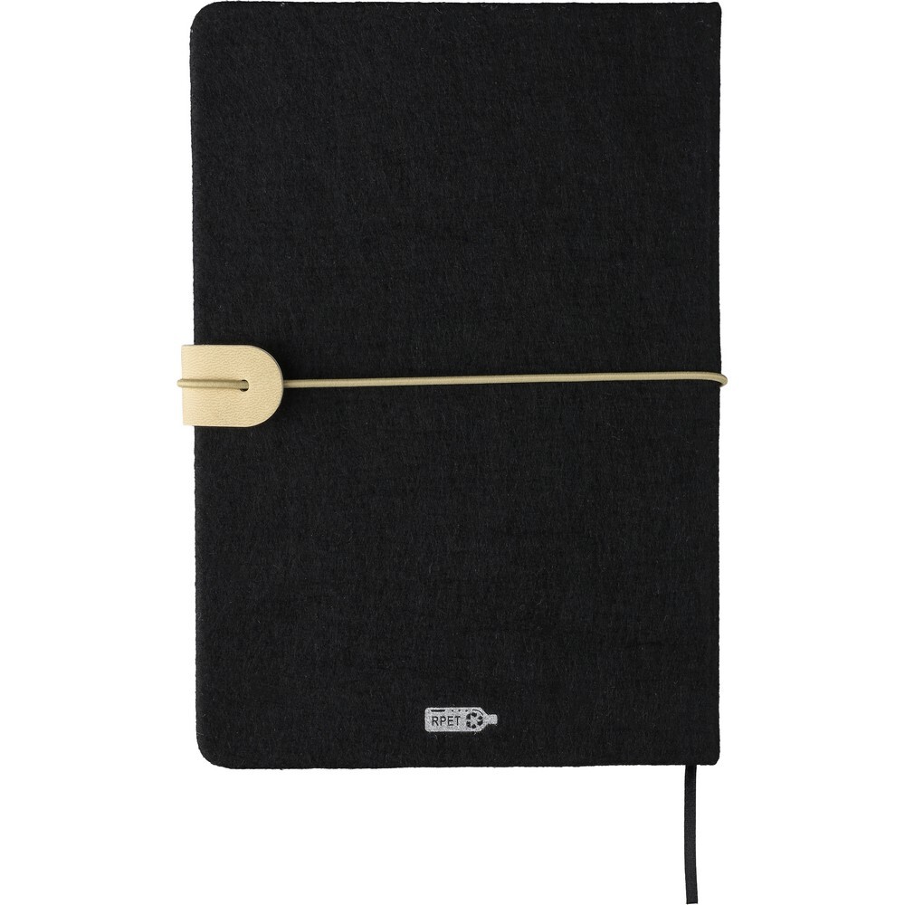 Notatnik ok. A5, 80 kartek w linie (70 g/m²) z zewnętrznym paskiem zamykającym, miękka okładka tasiemka zakładkowa umożliwia wygodne zaznaczanie ostatniej strony lub ważniejszych notatek, ikona recyklingu na produkcie, produkt wykonany z RPET i PU