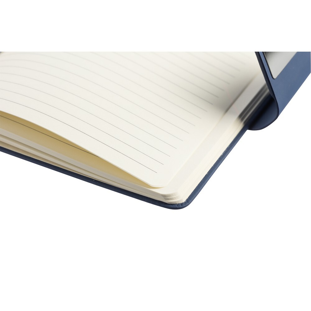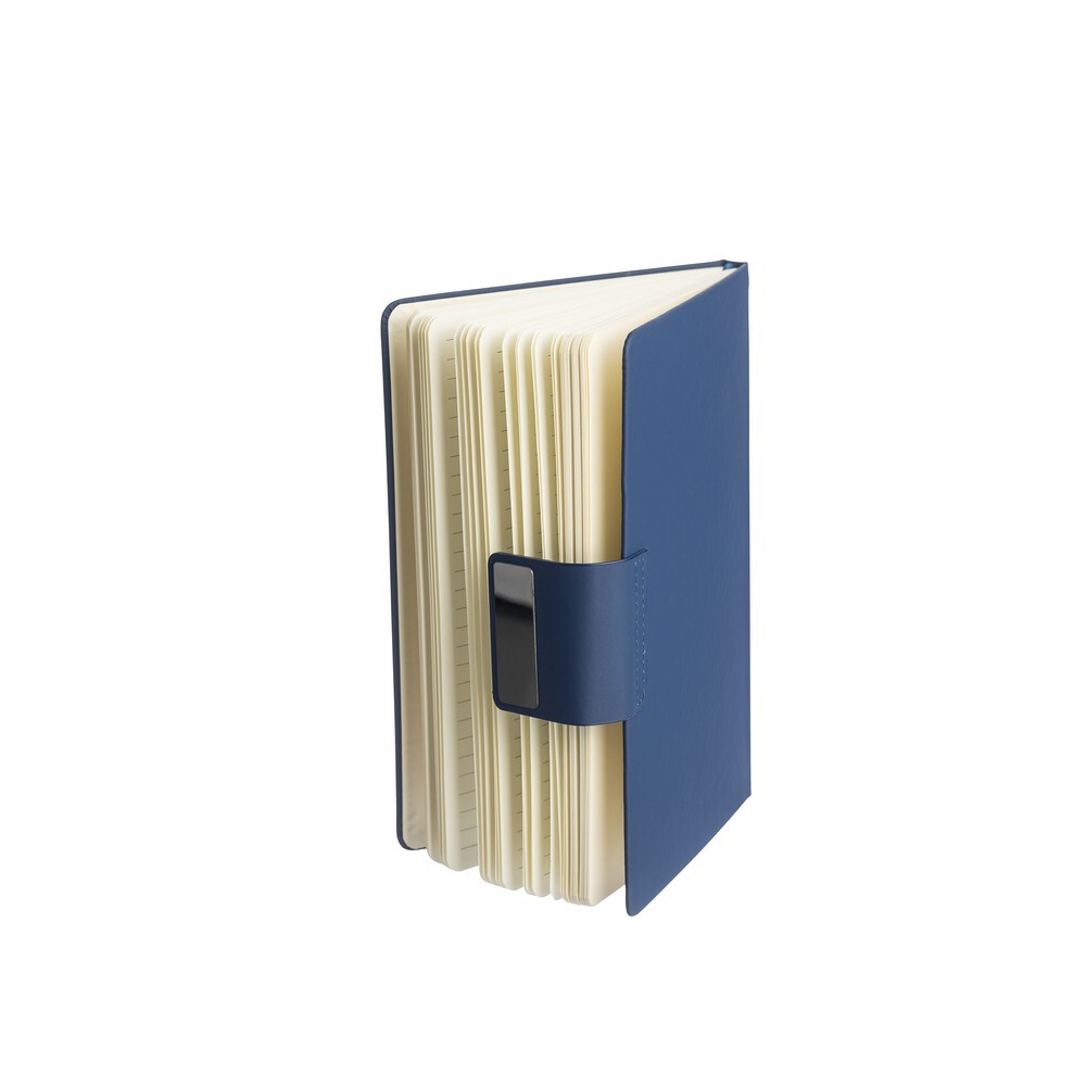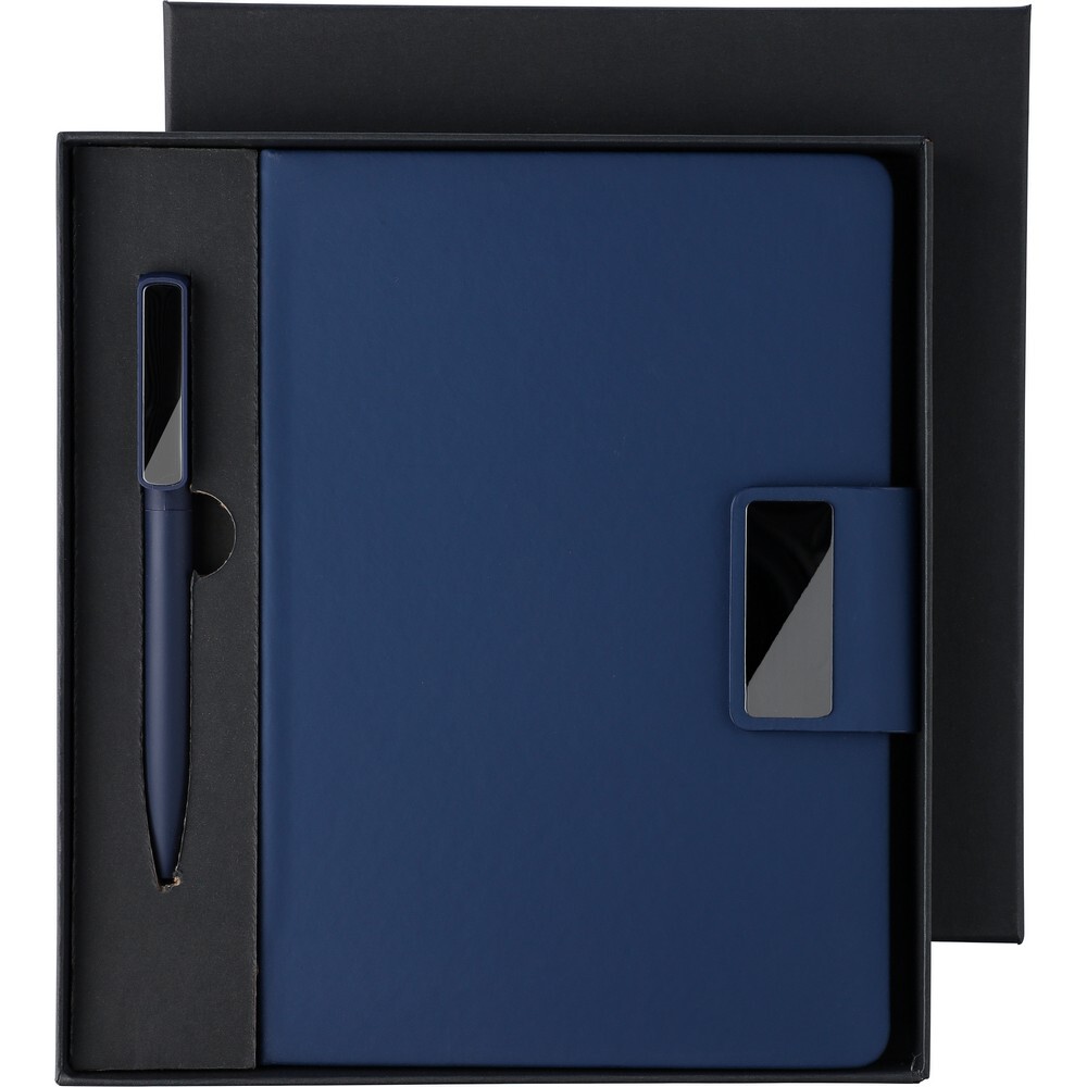 Zestaw upominkowy w ozdobnym pudełku: notatnik, 80 kartek w linie (70 g/m²), magnetyczne zapicie, tasiemka zakładkowa umożliwia wygodne zaznaczanie ostatniej strony lub ważniejszych notatek, długopis w niebieskim kolorze, ikona recyklingu na wszystkich produktach, produkt wykonany z kartonu, PU i poliestru