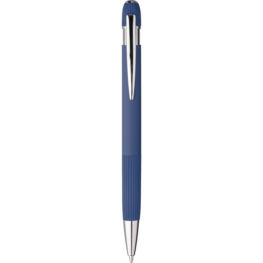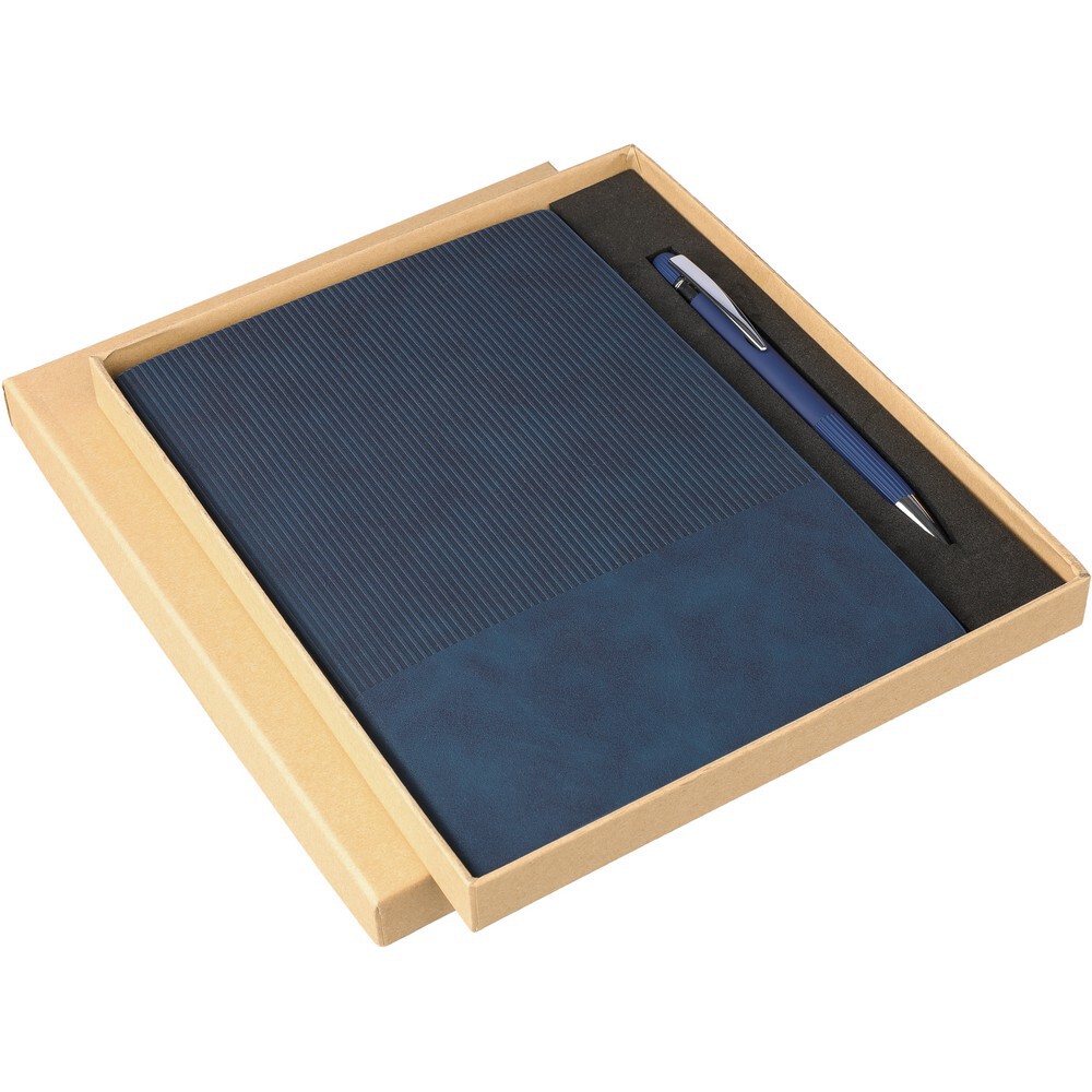 Notatnik ok A5, 100 stron w linie (70 g/m²) z twardą okładką przypominającą sztruks, tasiemka zakładkowa umożliwia wygodne zaznaczanie ostatniej strony lub ważniejszych notatek, długopis w komplecie, gumowe wykończenie, paskowane detale na trzonie i w górnej części, chromowana plastikowa końcówka, ikona recyklingu na obu produktach, zapakowane w brązowe kartonowe pudełko, produkt wykonany z PU i metalu