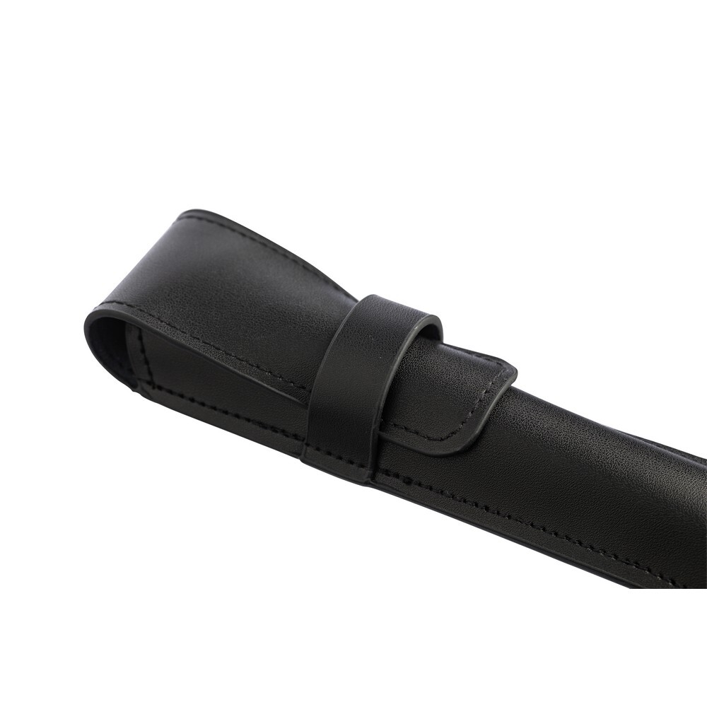 Dwuwarstwowe etui na długopisy ze skóry z klapką i paskiem zapinającym, miękka wyściółka od środka, zapakowane w rękaw papieru