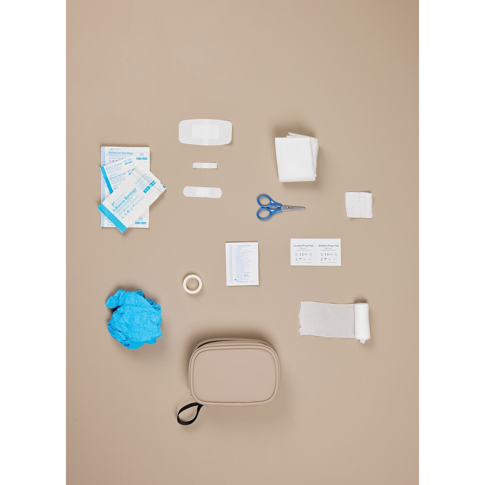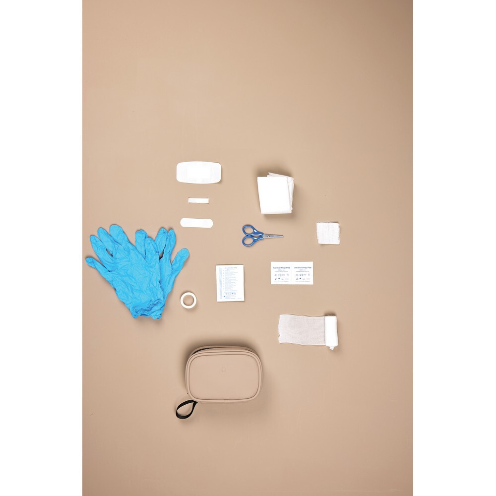 Apteczka, kompaktowa konstrukcja, zamykana na zamek błyskawiczny, wykonana z materiałów pochodzących z recyklingu z certyfikatem RCS, całkowita zawartość materiałów z recyklingu obliczona na podstawie wagi całkowitej przedmiotu: 23%