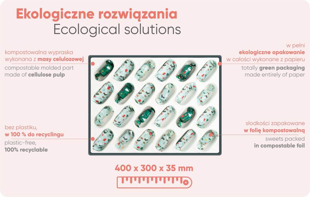 - Materiał przyjazny środowisku: papier kraftowy/biały, wypraska kompostowalna FSC