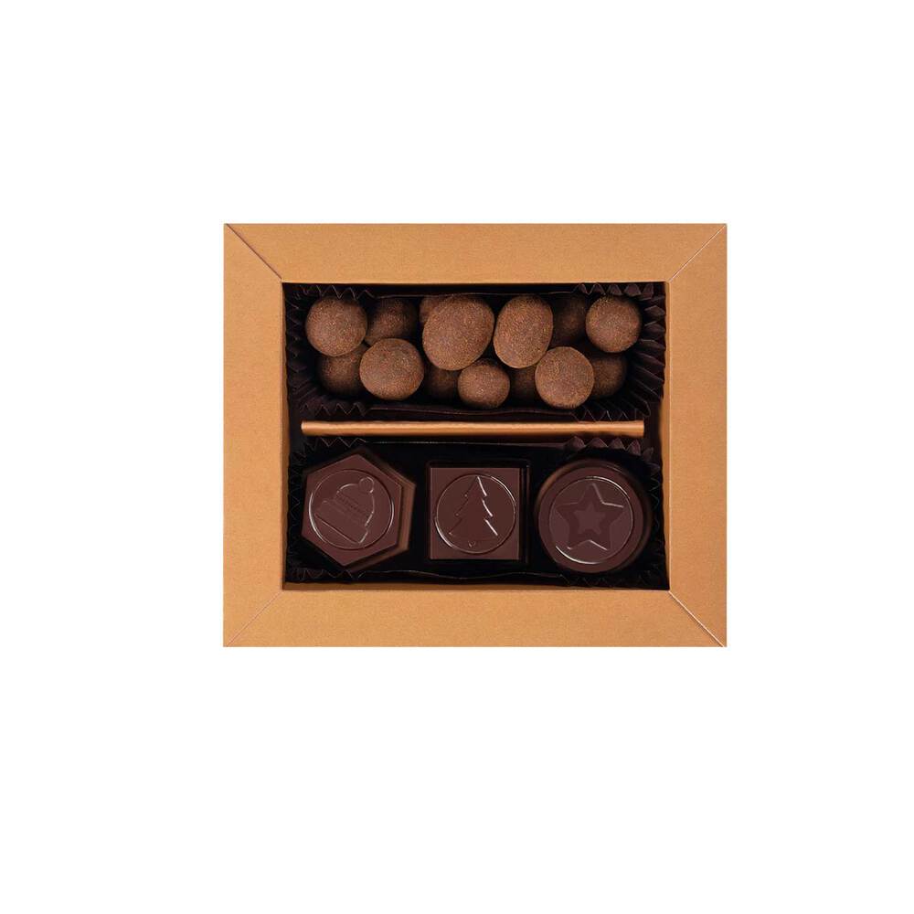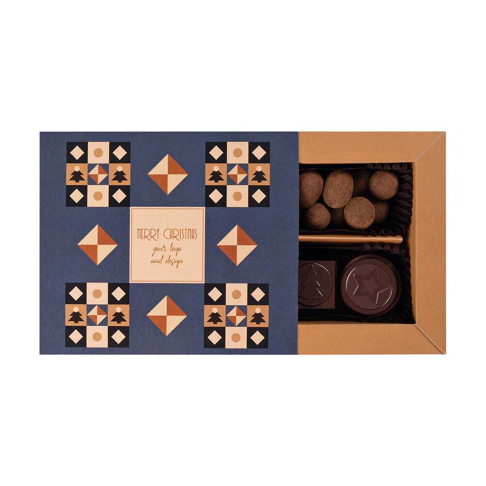 Mini bombonierka z możliwością personalizacji opakowania i pieczęci pralinek. Idealny prezent świąteczny dla klientów i partnerów biznesowych. Opakowanie w 100% biodegradowalne.
