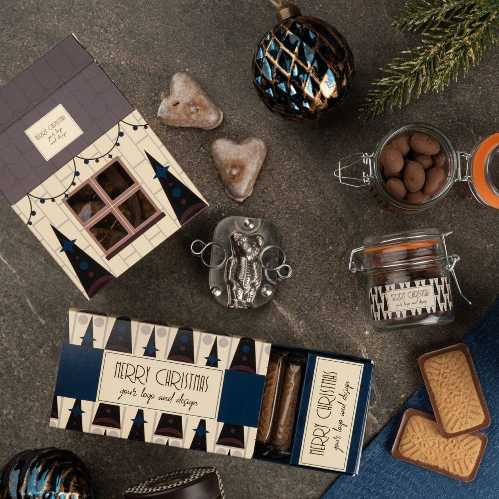 Aromatyczne pierniczki w pudełeczku w kształcie świątecznego domku, idealne na firmowe spotkania lub jako prezent dla klientów. Możliwość personalizacji opakowania i pierniczków.